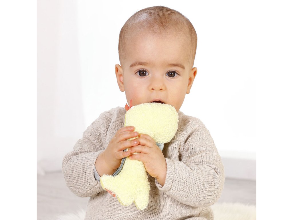Měkký plyšový kamarád ve tvaru dinosaura potěší každé miminko. Podporuje přirozenou zvědavost a při zmáčknutí chrastí a píská. Měkký materiál je příjemný na dotek. Hračka podporuje vývoj sluchu, hmatu a jemné motoriky.