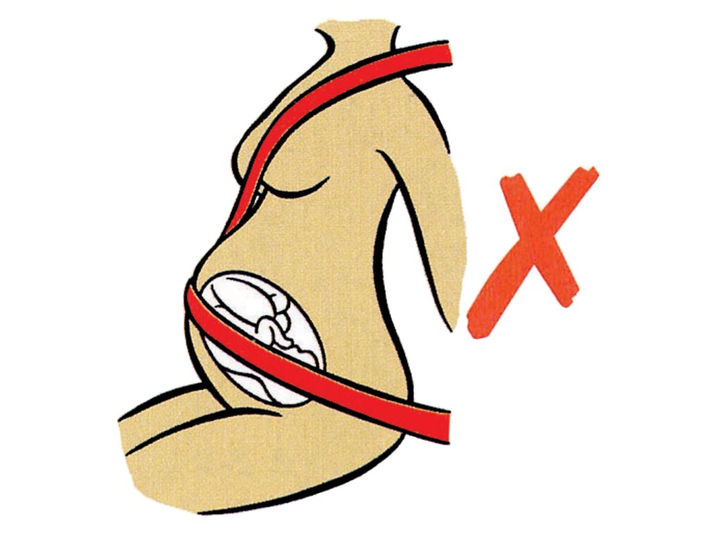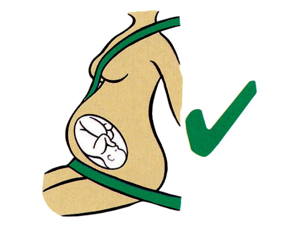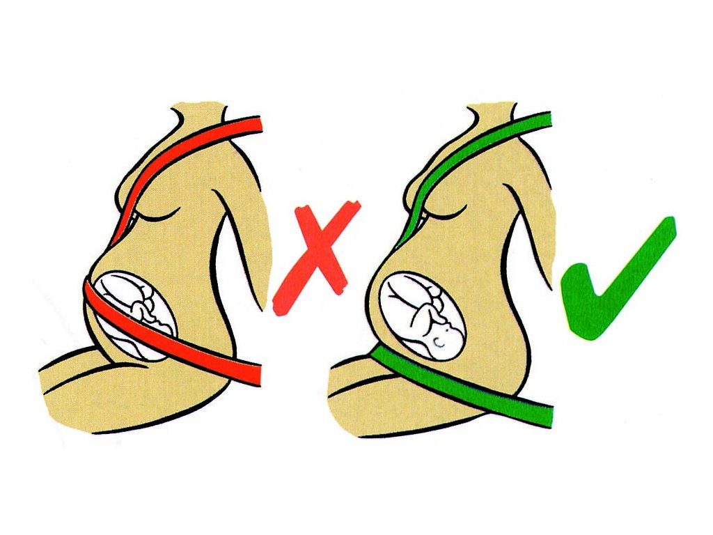 Statistiky nehod potvrzují, že nenarozené dítě může být vážně zraněno či zabito, když je bezpečnostní umístěn nad nebo přes matčino břicho.