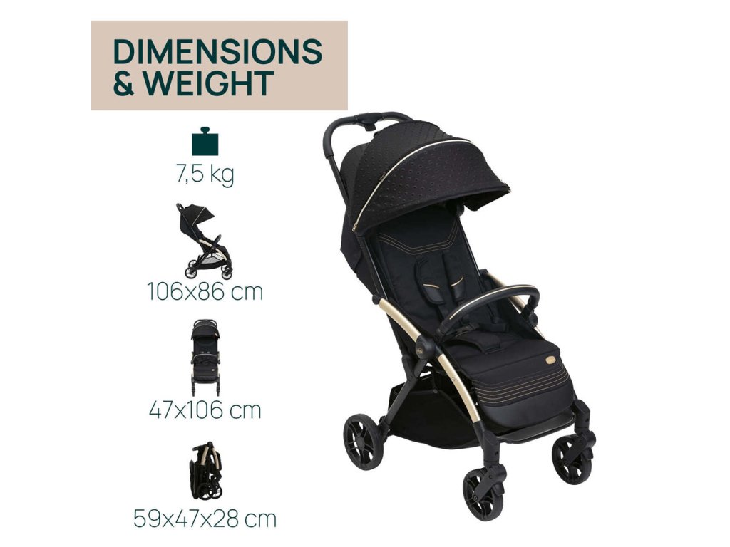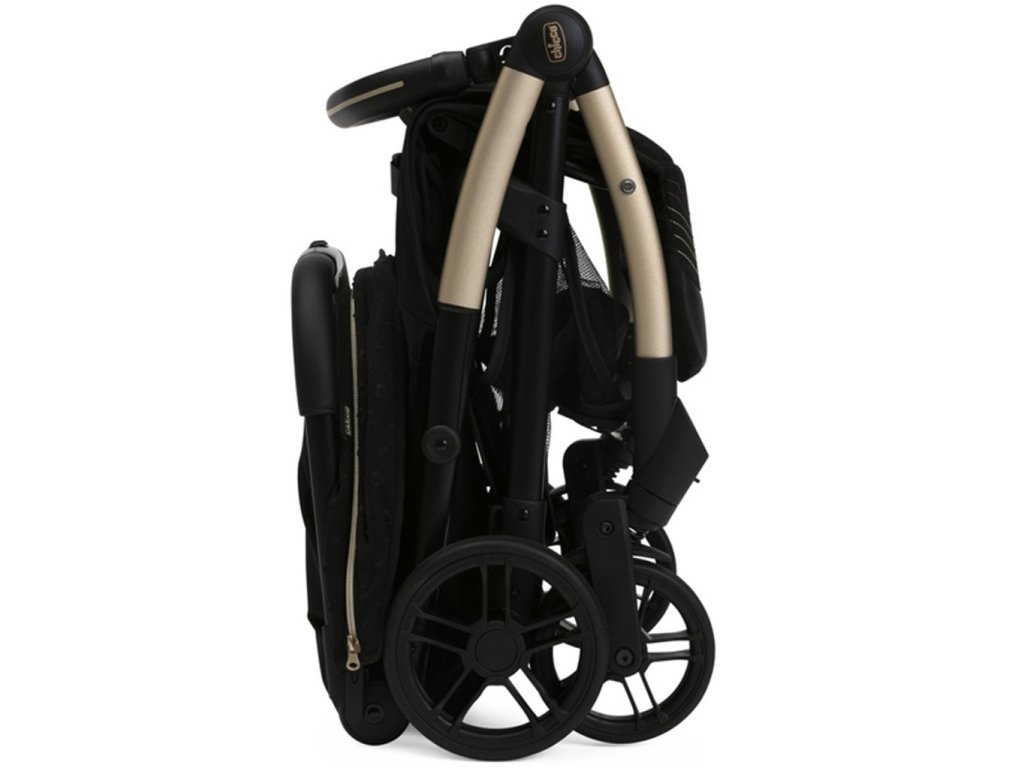 Stačí jeden dotek a kočárek se sám složí! Po složení je opravdu kompaktní a stojí samostatně. Madlo lze také poskládat pro dosažení větší kompaktnosti nebo může být použito jako rukojeť pro přenášení.
