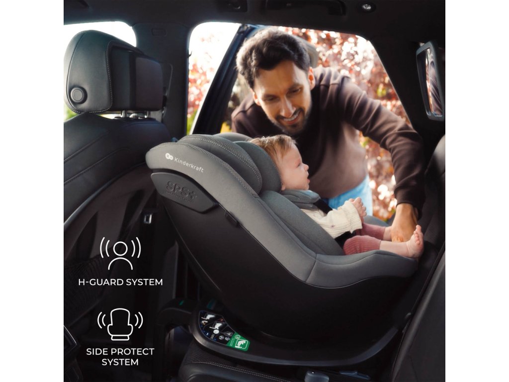 Sedačka obsahuje speciální bezpečnostní systémy, jako H-GUARD SYSTEM a SIDE PROTECT SYSTEM, které absorbují energii při nárazu a chrání citlivé části těla – hlavu, krční páteř a pánev. Měkké, prodyšné materiály nedráždí dětskou pokožku a široké, hluboké sedátko spolu s ventilovanou skořepinou zajišťují pohodlí i během horkých dnů.