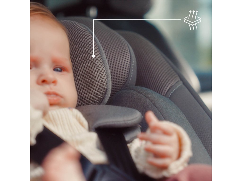Umožňuje jednou rukou nastavit výšku opěrky hlavy a pásů (6 úrovní). Široké, hluboké sedátko a měkce polstrované materiály zvyšují komfort. Součástí je také vyjímatelná vložka pro děti do 60 cm – zajišťuje lepší usazení a vyšší bezpečnost novorozenců.