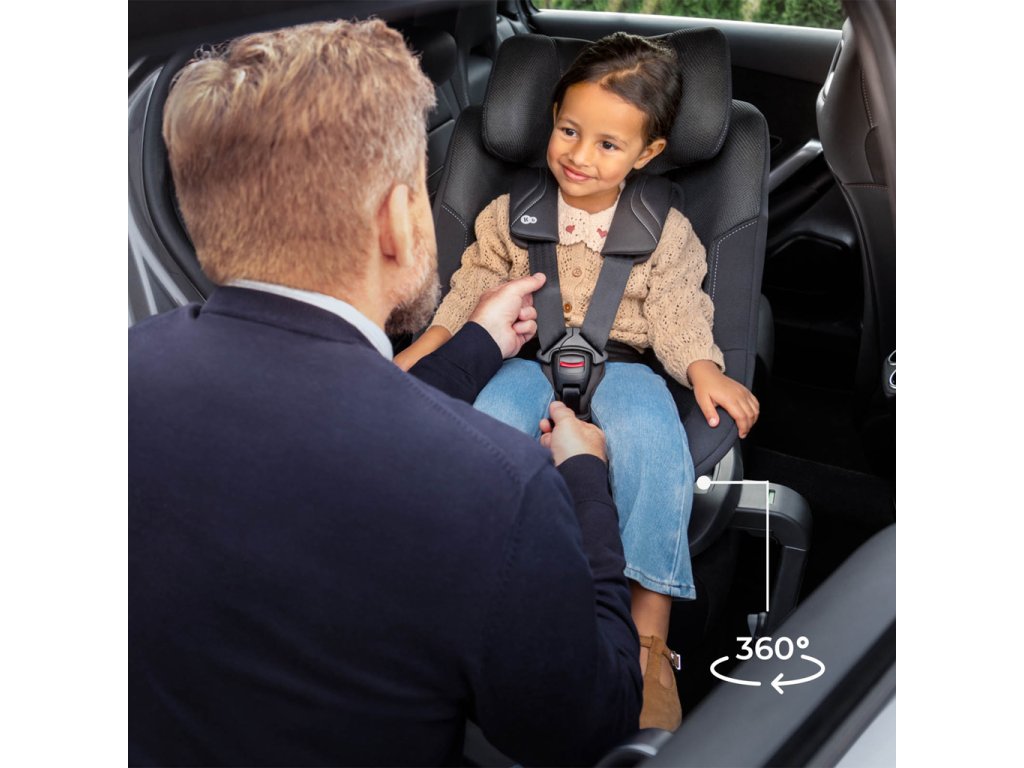 Umožňuje jednou rukou nastavit výšku opěrky hlavy a pásů (6 úrovní). Široké, hluboké sedátko a měkce polstrované materiály zvyšují komfort. Součástí je také vyjímatelná vložka pro děti do 60 cm – zajišťuje lepší usazení a vyšší bezpečnost novorozenců.