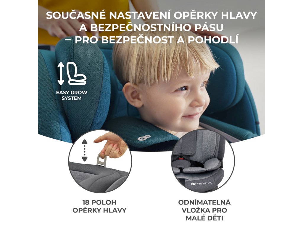 Opěrku hlavy lze nastavit a nastavit až do 18 úrovní. EASY GROW SYSTEM umožňuje současně a jednou rukou nastavit opěrku hlavy a popruhů. Pamatujte, že správně nastavená opěrka hlavy zvyšuje bezpečnost dítěte při nehodě! Popruhy lze schovat v sedadle, když dítě vyroste natolik, že se může připoutat bezpečnostním pásem v autě.