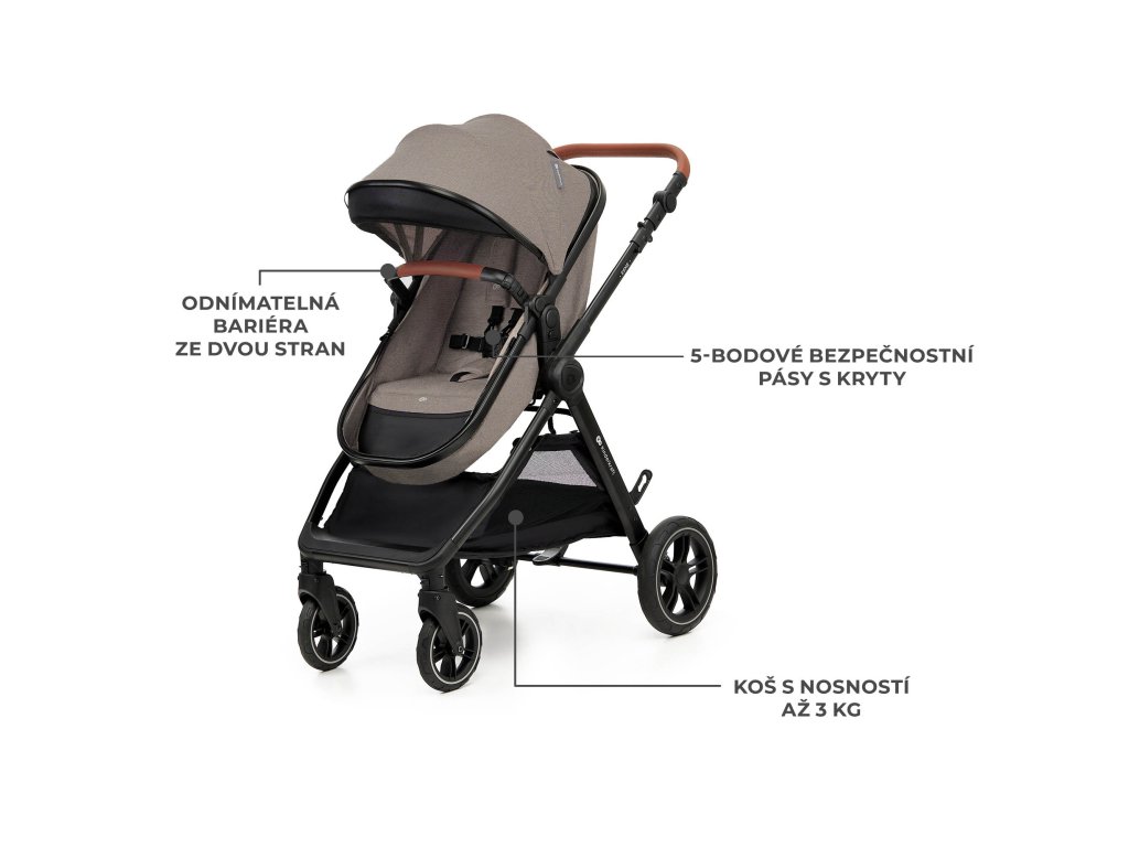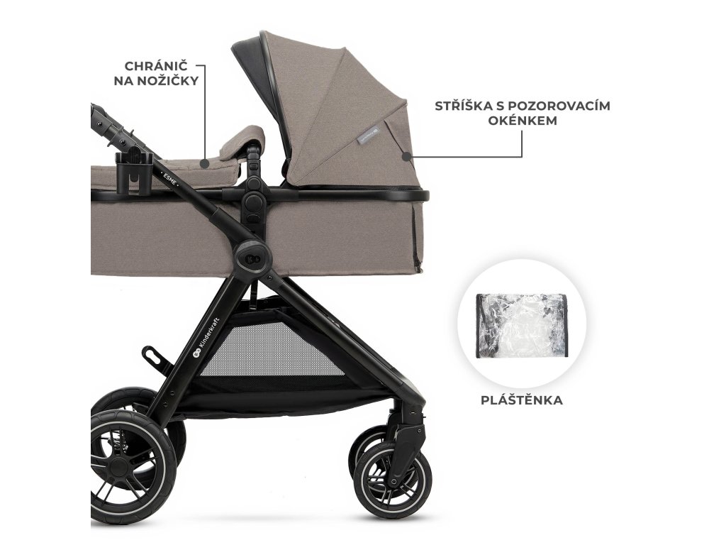 Kočárek 3 v 1 ESME má velkou stříšku s okénkem pro kontakt s dítětem, která chrání před větrem i sluncem. Pod sedadlem se nachází prostorný košík s nosností až 3 kg – ideální pro nákupy nebo nezbytné doplňky. O bezpečnost dítěte se starají nastavitelné 5-bodové pásy s měkkými polstry a odnímatelné madlo, které lze otevřít z obou stran.