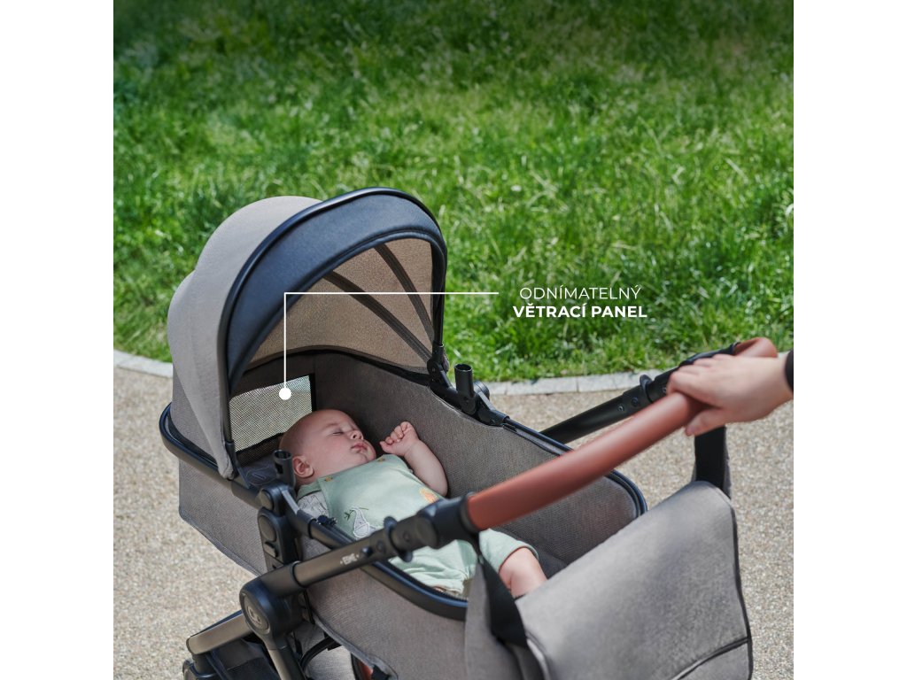 ESME byl navržen pro pohodlí každého dítěte. Pro nejmenší je připravena prostorná vanička s ventilačním panelem a velkou stříškou s okénkem na kontakt s dítětem. Vanička je měkká a pohodlná – ideální pro spánek na čerstvém vzduchu.