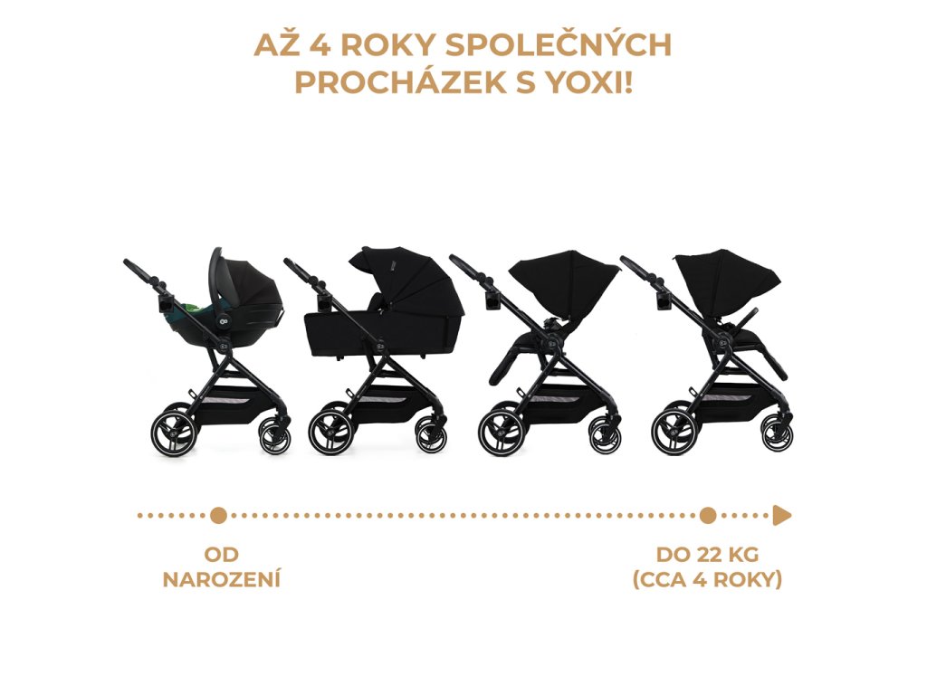 Kočárek YOXI 3 v 1 byl vytvořen pro děti od narození do přibližně 4 let (22 kg). Velká pohodlná korba s měkkou matrací byla navržena speciálně pro miminka, a když dítě vyroste, můžete ji jednoduše vyměnit za sportovní sedačku, kterou lze používat ve směru nebo proti směru jízdy.
