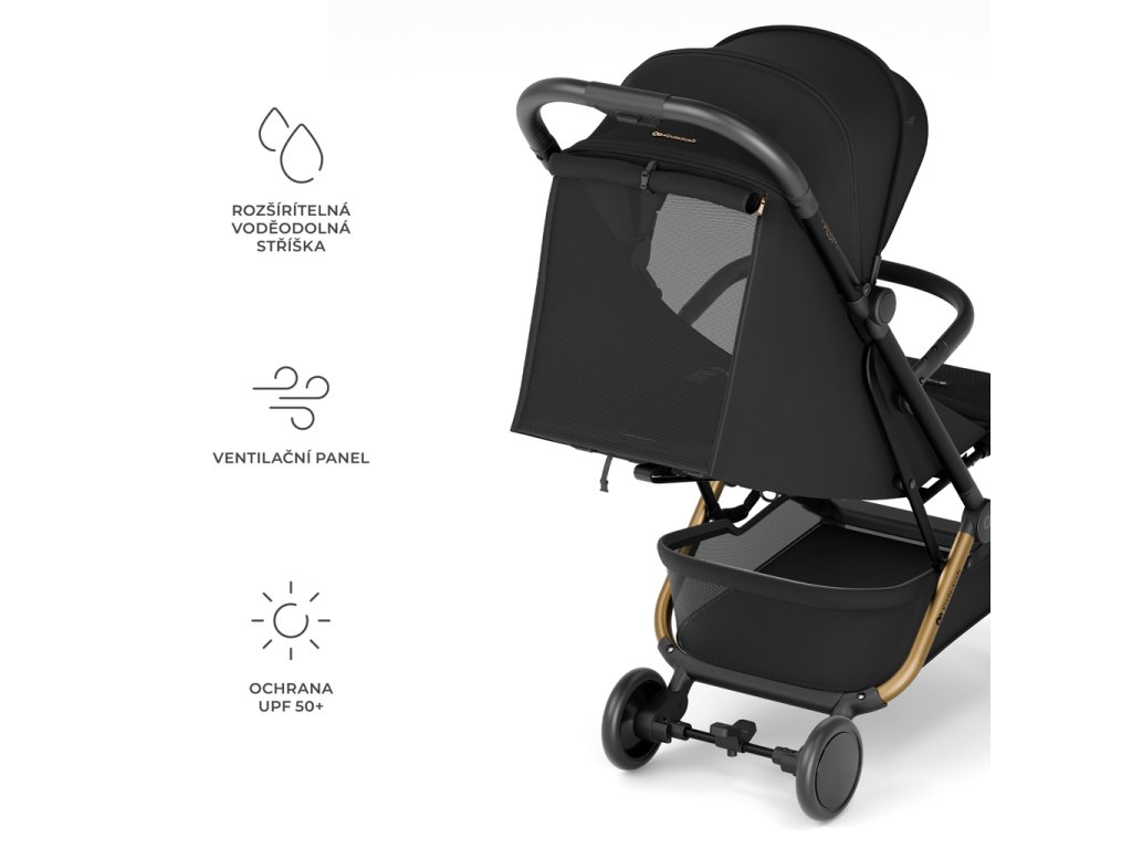 Nepromokavá stříška vyrobená z materiálu UPF 50+ účinně chrání vaše dítě před sluncem a deštěm. Dá se prodloužit a poskytnout tak ještě větší ochranu při měnících se povětrnostních podmínkách. Dodatečný ventilační panel zlepšuje cirkulaci vzduchu a umožňuje sledování vašeho dítěte.