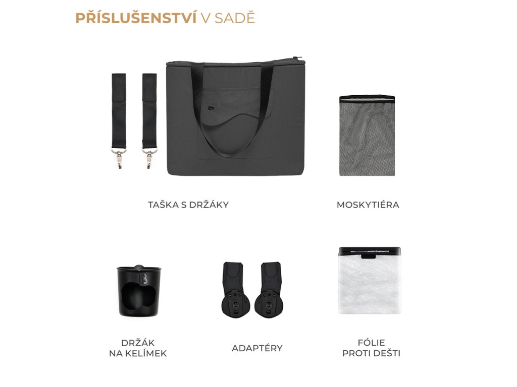 Ke kočárku patří také řada praktického příslušenství, jako je moskytiéra, pláštěnka, držák na nápoje, taška na rukojeť pro rodiče a adaptéry na autosedačku. Pokud již máte dětskou autosedačku, můžete z ní díky adaptérům vytvořit TRAVEL SYSTEM. A to vše v jednom kočárku!