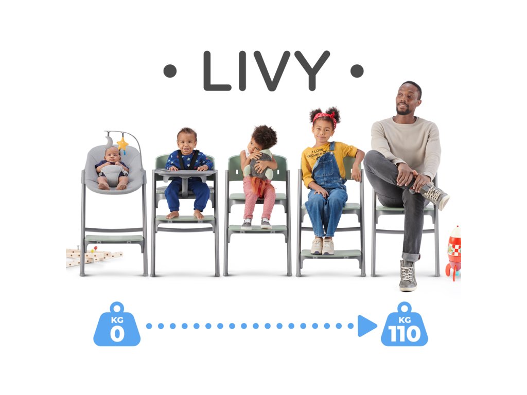 - vysoká židlička pro celou rodinu - lIVY bude sloužit dítěti od narození do hmotnosti 110 kg. Dítě potřebuje pomoci s kreslením? Na židli se můžete snadno posadit s dítětem na klíně.