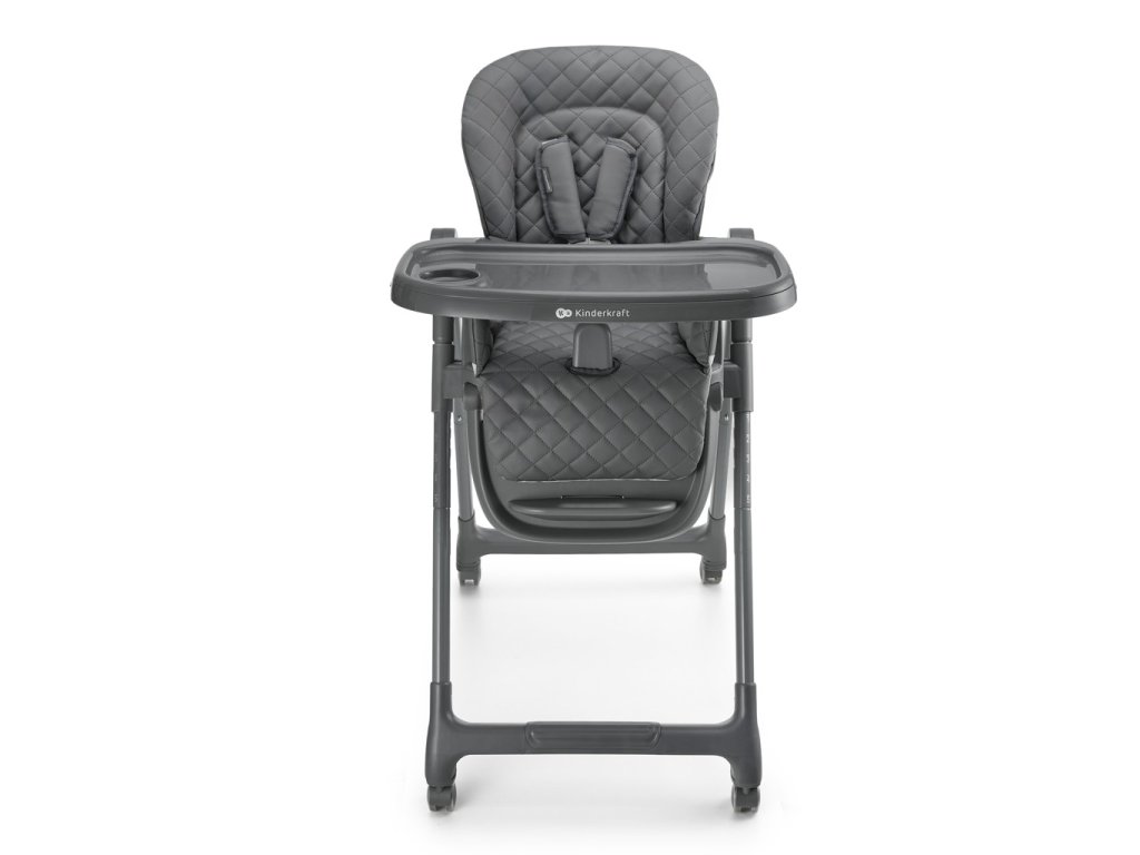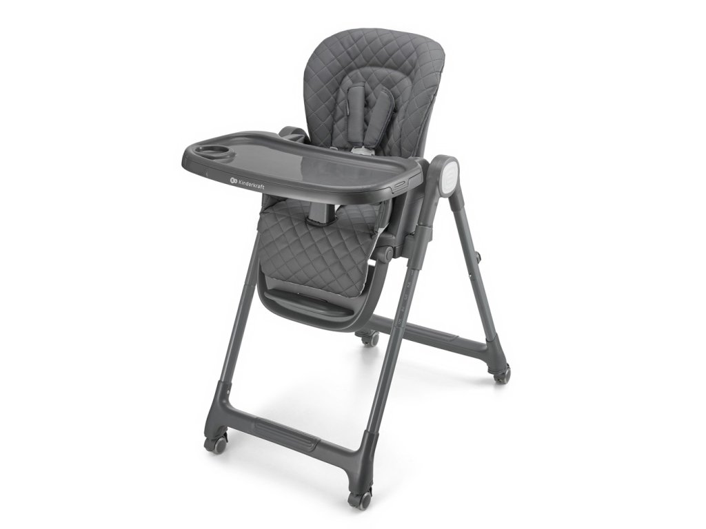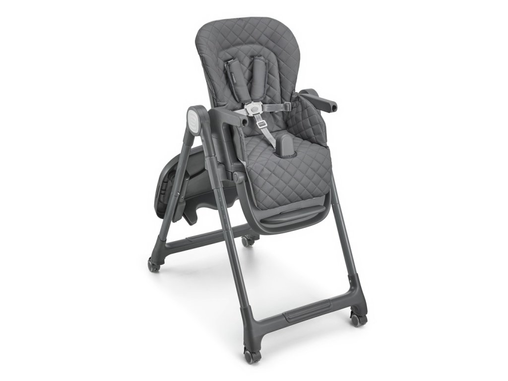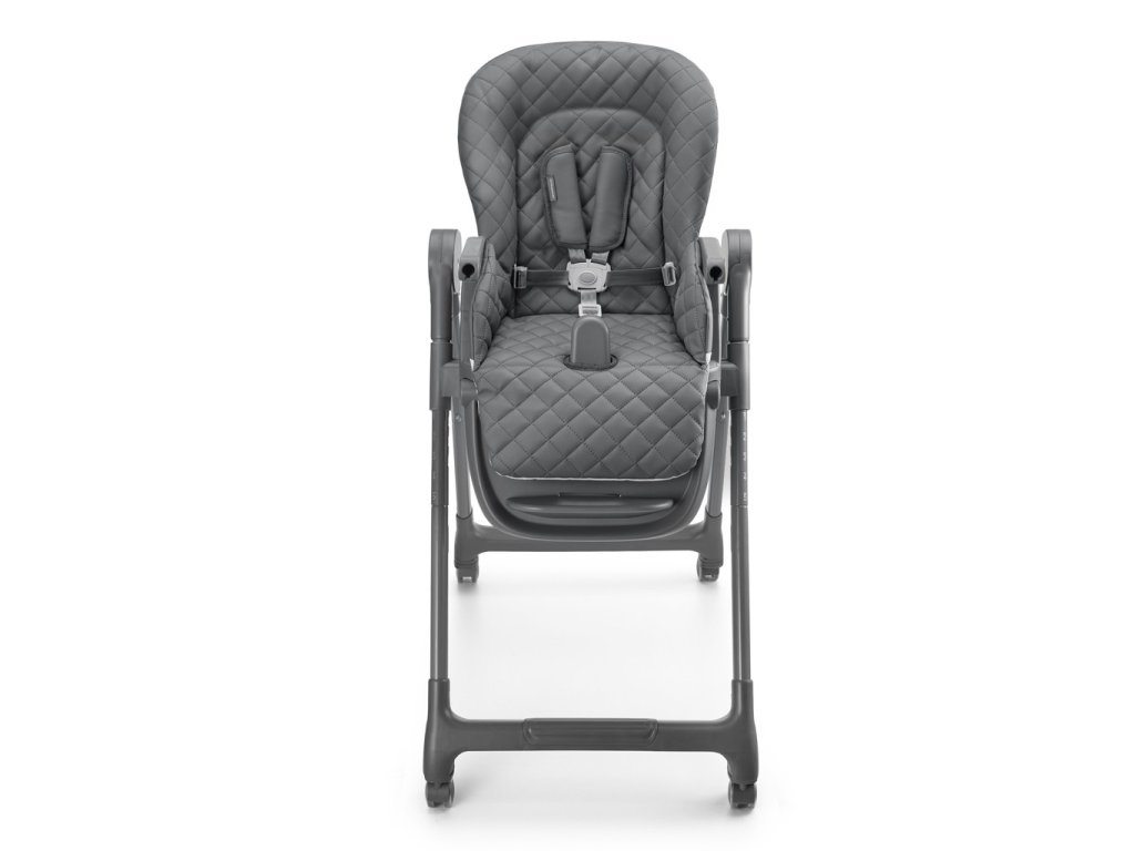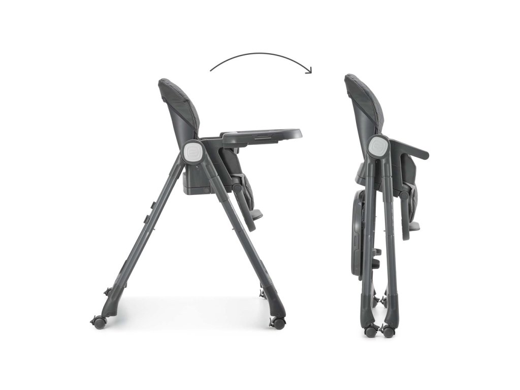 Integrovaná kolečka s brzdami, 5-bodové bezpečnostní pásy a měkké, snadno čistitelné PU čalounění zvyšují pohodlí a bezpečnost dítěte. Po složení má židle mimořádně kompaktní tvar, což usnadňuje její uskladnění. Zabírá minimum místa, takže se snadno vejde do rohu nebo skříně.