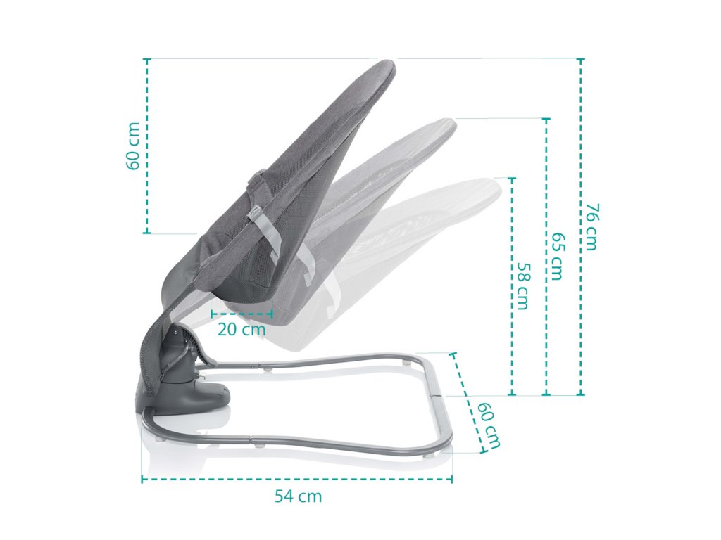 Pevná kovová konstrukce poskytuje oporu a stabilitu pro děti od narození až do 9 kg. Moderní čistý design doplňuje středová část, která je tvořena odolnou síťkou. Ta umožňuje proudění vzduchu k dítěti a reguluje tak teplotu miminka. Lehačka je dostupná ve dvou barevných variantách – šedobéžové a šedé. Lehce tak zapadne do jakéhokoliv interiéru, aniž by jej narušila výraznými barvami. Součástí jsou pevné popruhy pošité měkkou látkou, které zajistí bezpečí dítěte při houpání.