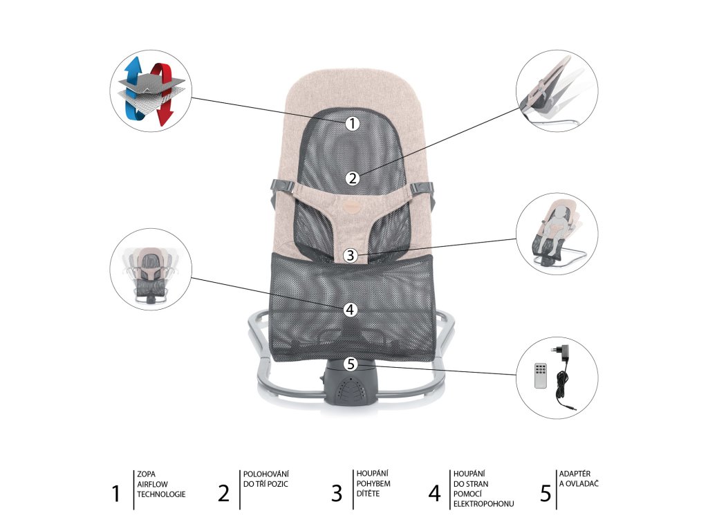 Zádová opěrka je polohovatelná do 3 poloh podle toho, zda chce miminko pozorovat svět kolem sebe, nebo spíše pospávat. Systém houpání je zajištěn dvěma způsoby – první je nezávislý na elektrické energii, kdy se lehačka rozhoupe pohyby dítěte, druhý je pak pomocí elektropohonu, který lehačku rozhoupe do stran. Elektrické houpání má 5 druhů intenzity, které lze libovolně volit podle toho, co je dítěti nejpříjemnější. Napájení je řešeno pomocí adaptéru, který se dodává v balení. Lehačka také obsahuje sloty na AAA baterie, takže lehačku můžete vzít sebou na cesty i tam, kde není dosah elektrických sítí. Součástí je také časovač s intervaly 8,15 a 30 minut. Užitečnou funkcí je automatické zapnutí, které se aktivuje ihned, když lehačka zaznamená pohyb dítěte. Všechny funkce lze ovládat přes panel v přední části nebo lze využít dálkový ovladač, který je součástí balení.