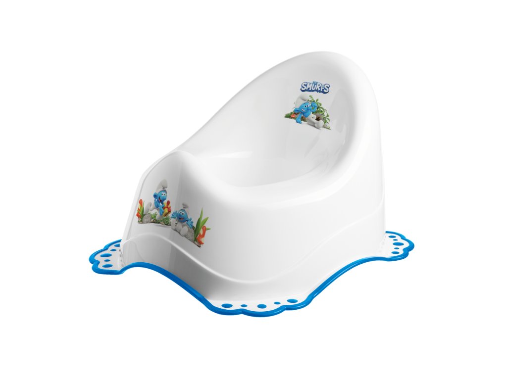 Nočník s protiskluzem v designu The Smurfs - Šmoulové je vyroben z tvrzeného, nezávadného plastu a je zárukou pohodlí a bezpečnosti Vašeho dítěte. Díky protiskluzové vrstvě je nočník velmi stabilní. Vysoká zádová opěrka zajišťuje pohodlné sezení a také zvyšuje stabilitu. Nočník je navržen s ohledem na anatomické rozdíly mezi chlapci a dívkami. Je lehce omyvatelný. Vyvýšená přední část zabraňuje úniku moči.