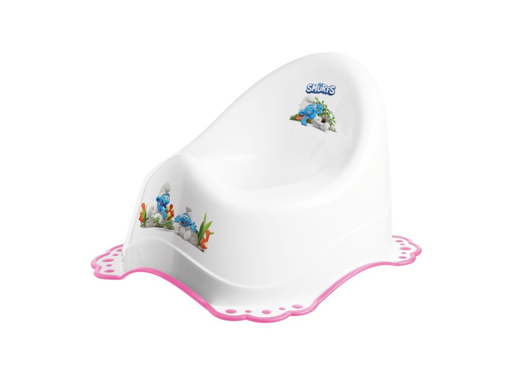 Nočník s protiskluzem v designu The Smurfs - Šmoulové je vyroben z tvrzeného, nezávadného plastu a je zárukou pohodlí a bezpečnosti Vašeho dítěte. Díky protiskluzové vrstvě je nočník velmi stabilní. Vysoká zádová opěrka zajišťuje pohodlné sezení a také zvyšuje stabilitu. Nočník je navržen s ohledem na anatomické rozdíly mezi chlapci a dívkami. Je lehce omyvatelný. Vyvýšená přední část zabraňuje úniku moči.