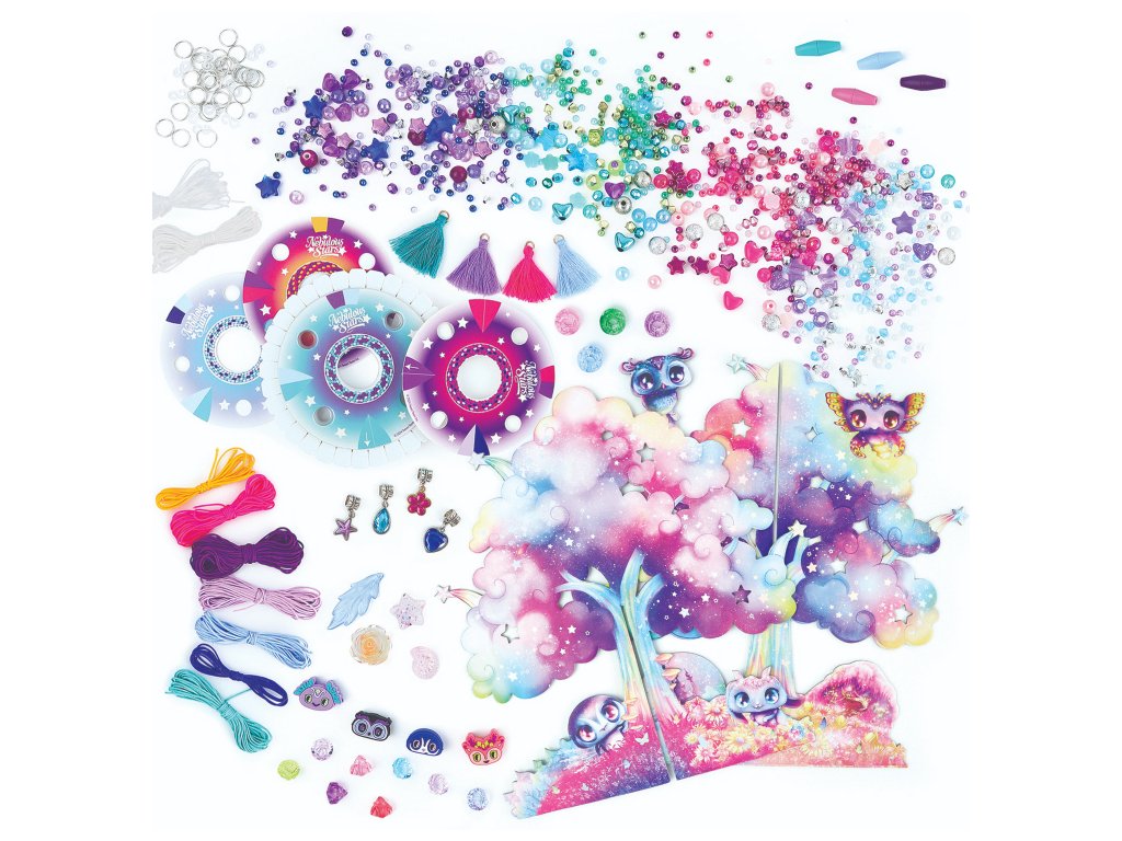 Obsah balení - kartonový hvězdný strom na pověšení šperků, 4 splétací kruhy na pletení náramků ve 4 vzorech, nylonové provázky 8 barev, 6 metrů elastického provázku, přes 2000 korálků různých tvarů a barev, 4 kovové přívěsky, 4 střapcové přívěsky, 4 gumové přívěsky s animouši, 10 kovových spon, 30 spojovacích kroužků, obrázkový návod.