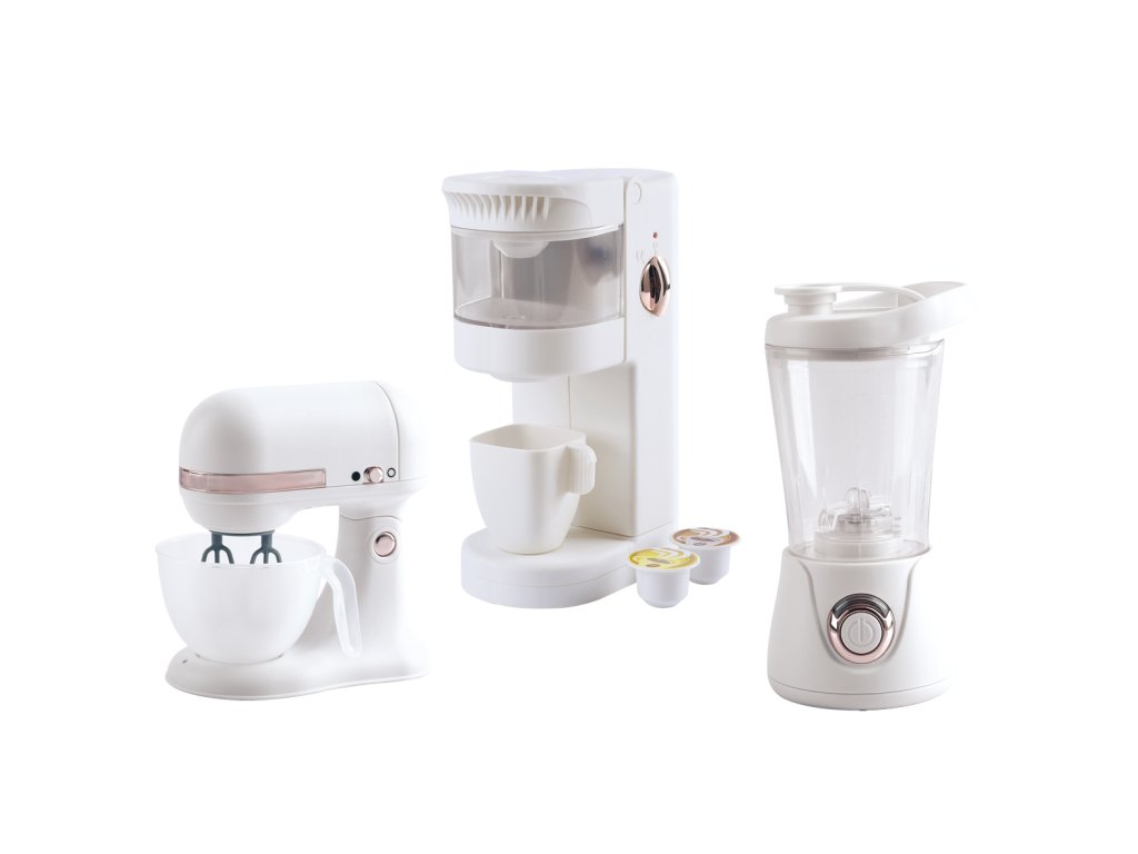Kuchyňské spotřebiče set 3ks. Obsahuje mixér 20cm, kávovar 20cm a kuchyňský robot 16cm. 2xAA do kuchyňského robota a 2xAAA do mixéru, 2xAAA do kávovaru. Kávovar má nádržku na vodu, která protéká do hrnečku. mixér při podržení tlačítka mixuje, kuchyňský robot má přepínač na zapnutí a vypnutí šlehání.Doplňkové parametry