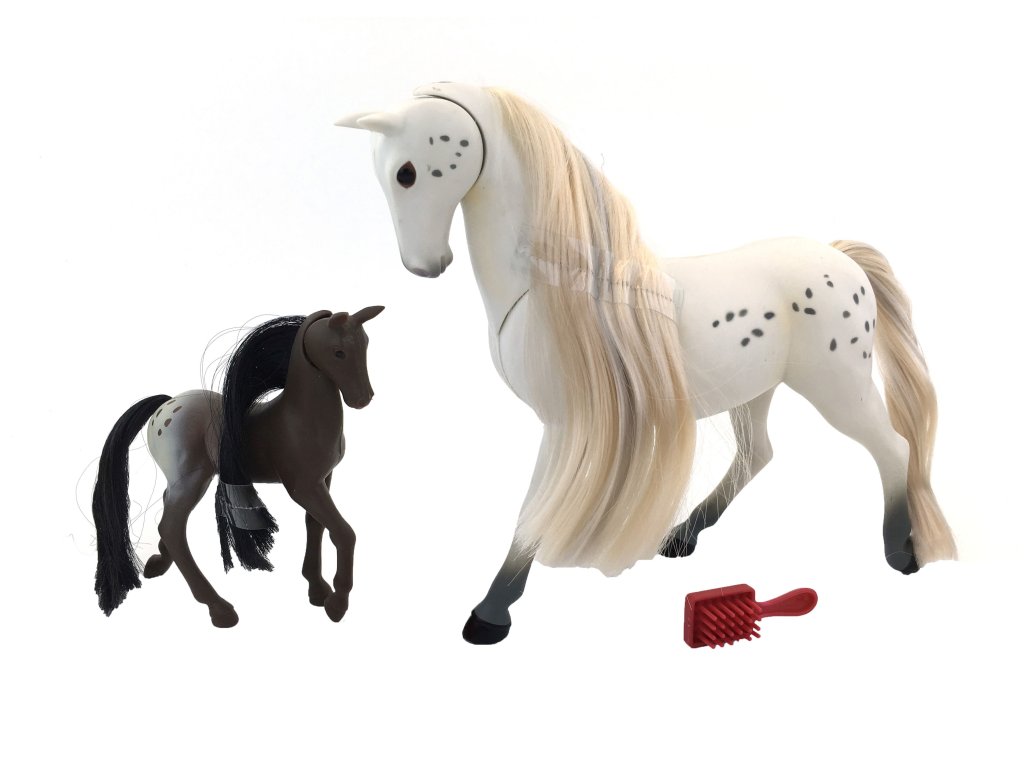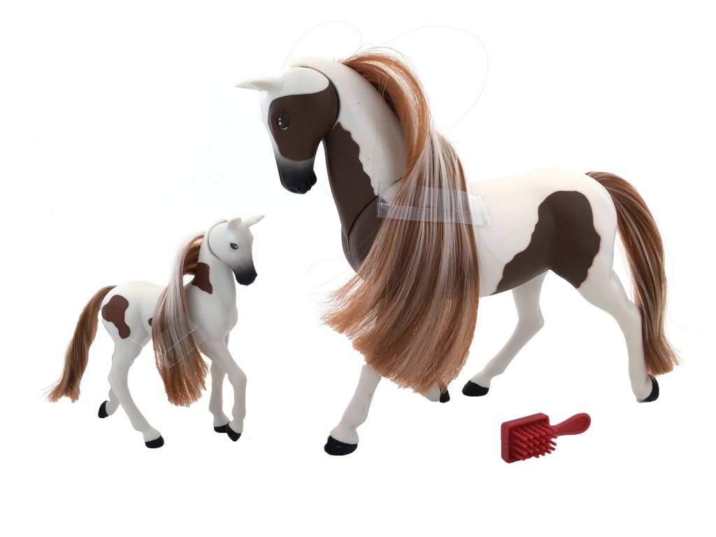 Hříbátko má svoji maminku velmi rádo. Vždy když se k němu nakloní dá jí pusinku. Součástí balení je jablko, mrkev a kartáč na rozčesání jejich krásné hřívy. Velikost koní: 18 a 11 cmDoplňkové parametry