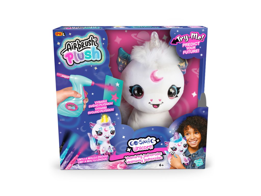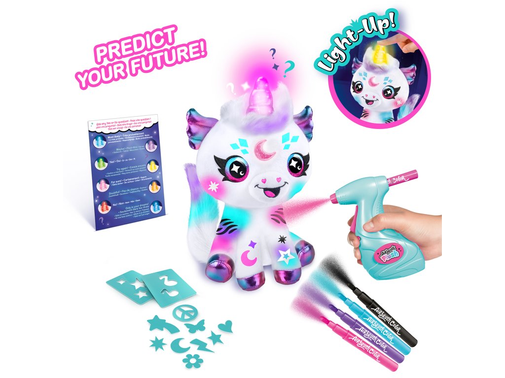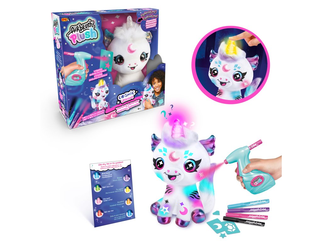 Navrhni a vybarvi si svého vesmírného jednorožce. Součástí tohoto balení je plyšové zvířátko, airbrush nástroj, 4 různé barevné náplně, 100 různých šablon a návod. Plyšové zvířátko si můžeš pomocí airbrushe libovolně posprejovat, můžeš využít různé barvy a šablony. Fantazii se meze nekladou. Pokud se ti vytvořený design přestane líbit, stačí plyšáka omýt vodou a můžeš začít znovu. Plyšákovi svítí kouzelný roh a může odpovědět na otázku ano-ne (jazyk hračky je angličtina). Výrobek je vhodný proDoplňkové parametry