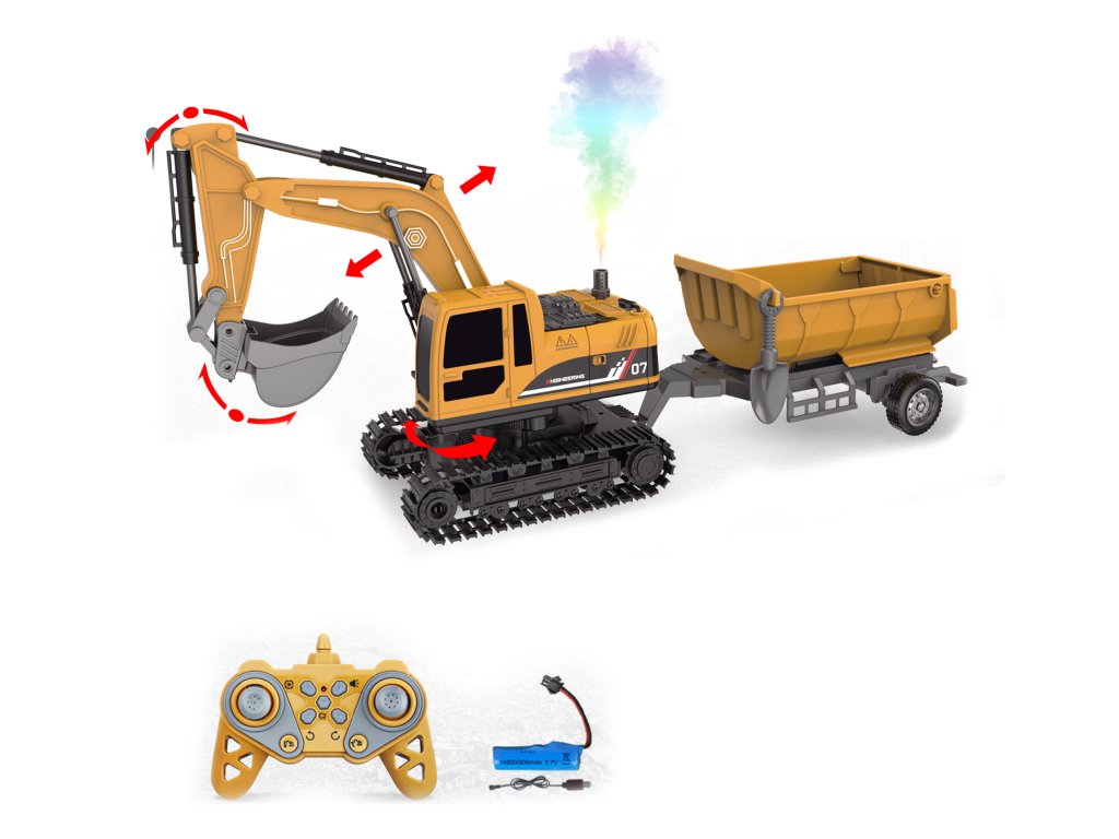 Bagr 4v1 s vlečkou RC na dálkové ovládání. Velikost 45 cm, bagr 24 cm. Součástí kovová koncovka bagr, plastové koncovky; bagr, nakladač dřevin, bourací kladivo. Frekvence 2.4GHz. Světelné, zvukové a dýmící efekty. Bateriový pack 3.7V 500mAh Li-ion do bagru součástí, 2xAA do ovladače nejsou součástí. USB kabel součástí. Nádobka na vodu součástí. Nádržka na vodu v zadní části bagru. Přepínač ON/OFF ze spodní straně otočné věže. Ovladač - levá páčka - pohyb vpřed a vzad, pravá páčka - otáčení vlevo a vpravo, tlačítko demo, tlačítko aktivace zvukových efektů, tlačítko dýmící efekty, tlačítko otáčení věže vlevo, tlačítko otáčení věže vpravo, tlačítko pokládání ramene, tlačítko zvedání ramene.Doplňkové parametry