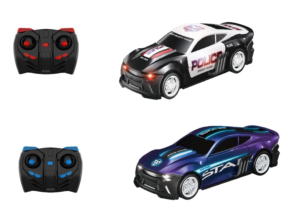 Bitva aut RC na dálkové ovládání. Součástí 2 auta. Velikost 25 cm. Frekvence 2.4GHz. Světelné efekty. Bateriový pack 3.7V do každého auta součástí, 2xAA do každého ovladače nejsou součástí. USB kabel součástí. ON/OFF tlačítko na ovladači. Nárazem do výfuku na levé straně auta dojde k jeho vykolejení.Doplňkové parametry