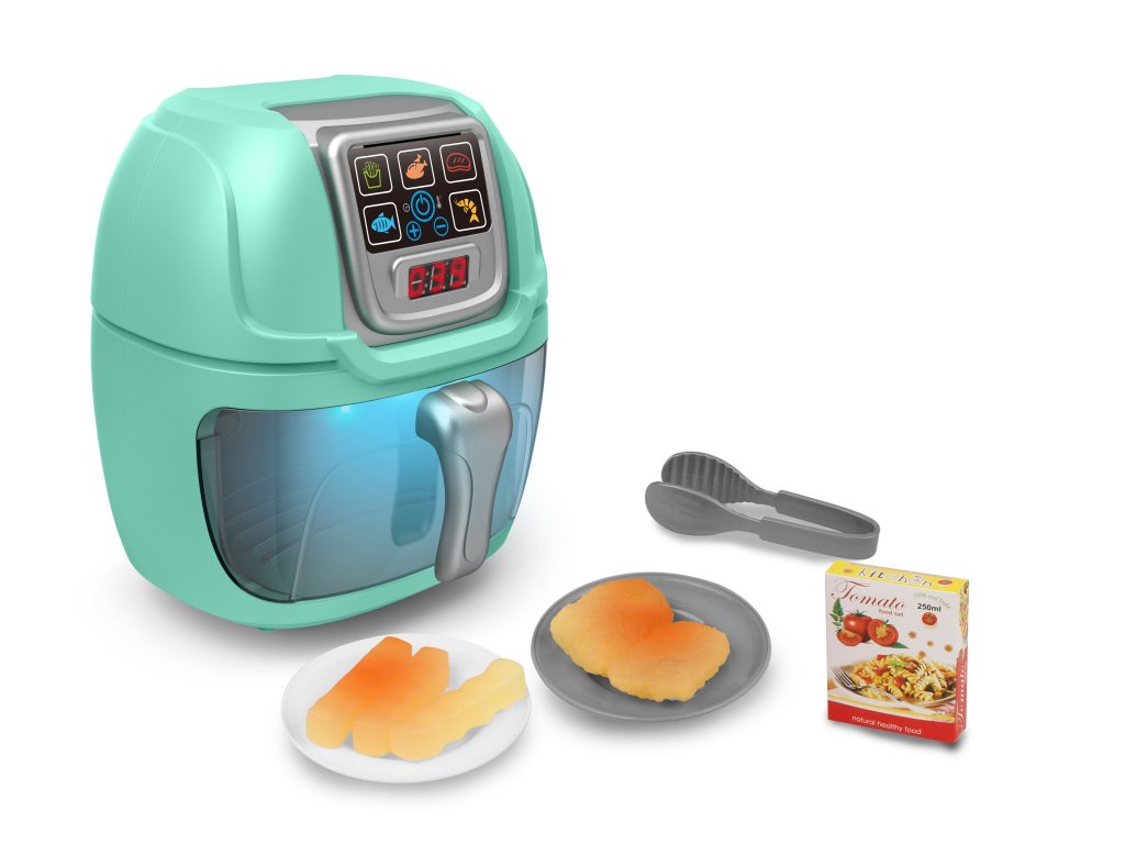 Obsahuje: fritézu, 2 nugety, 3 hranolky, krabičku těstovin, 2x talířek a kleštičky. 3xAA baterie součástí