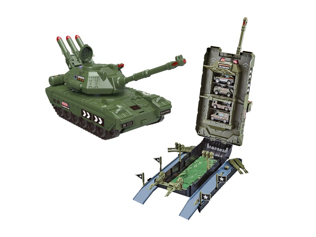 Garáž tank 44 cm 4 auta. Délka tanku 44 cm. Tank vydává světelné a zvukové efekty. Aktivace efektů 4 tlačítky na věži tanku. 4 auta 7 cm, volná kola. Tank je možné rozevřít a na strany připojit rampy. 3 kanóny na vystřelovací šipky. 3xAA baterie nejsou součástí.Doplňkové parametry