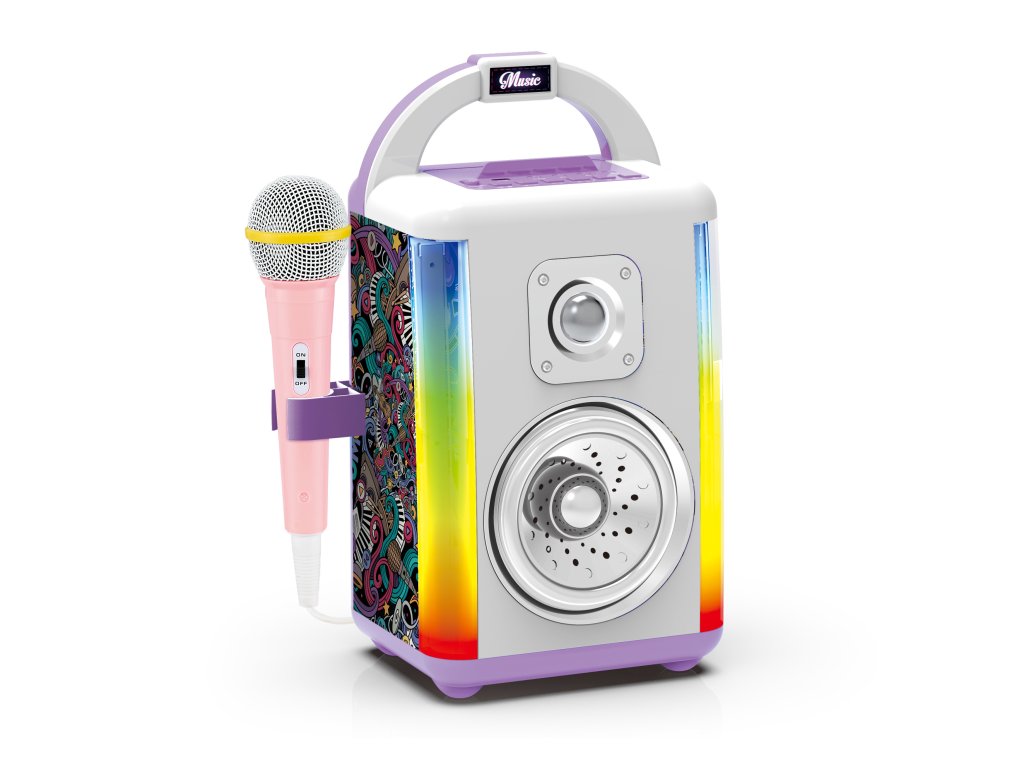 Hudební box 28cm. Rozměry 15x12x28cm. baterie 4xAA není součástí, poslech až 10 písniček, nahrávání, změna hlasu, až 5 módů osvětlení, tlačítko potlesku, 4 úrovně hlasitosti, bluetooth, nabíjecí port, sluchátkový port, připojení 2 mikrofonů, po pěti minutách nečinnosti režim spánku, přenosný, AUX připojení, 1 mikrofon v balení. Popis funkcí na obale i v balení.Doplňkové parametry