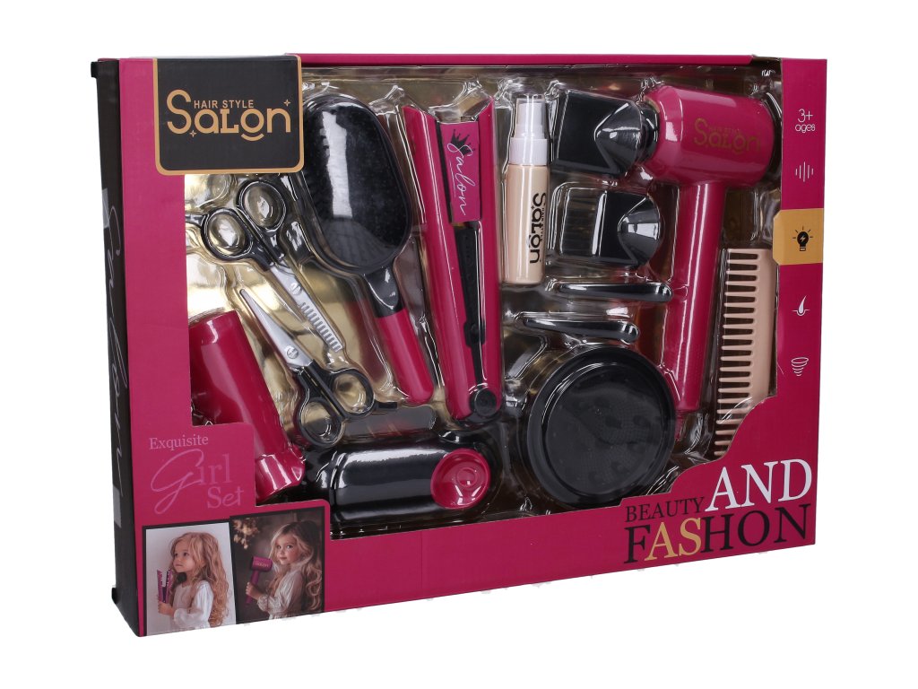Kosmetický set s fénem a žehličkou set. Baterie do fénu 2xAA nejsou součástí, baterie do žehličky 2xAAA nejsou součástí. Obsahuje fén, žehličku, kartáč, hřeben, 2x nůžky, 2x sponky, sprej, nástavce.Doplňkové parametry