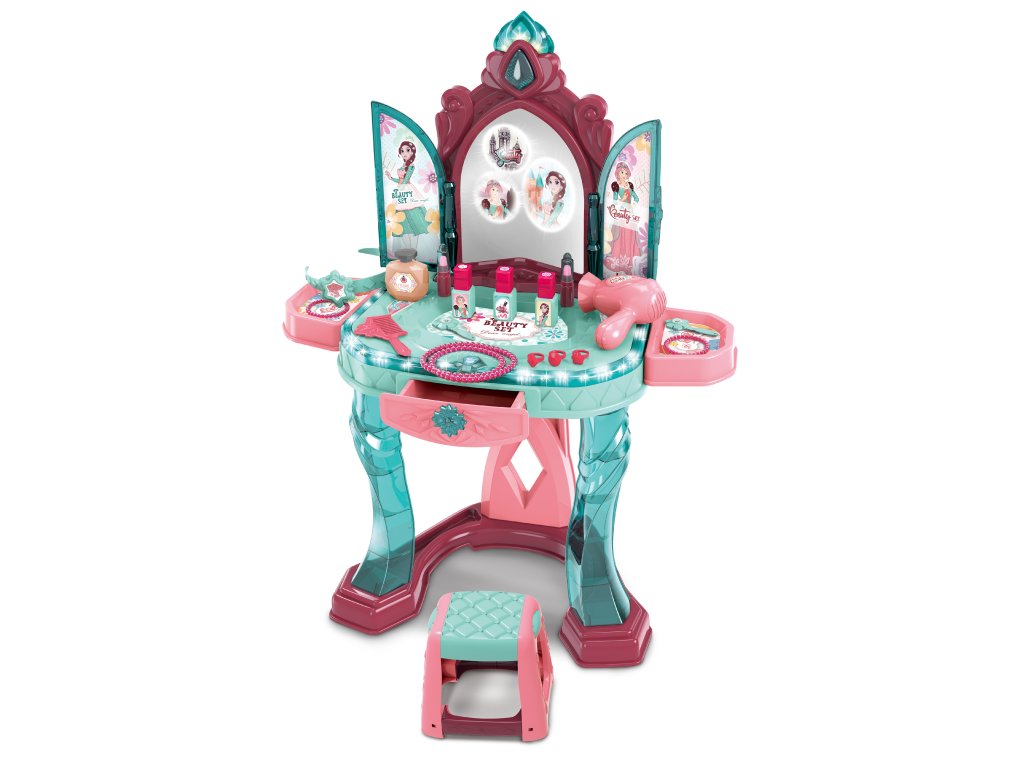 Kosmetický stolek s efekty. Rozměry 57x34x76cm. Světelné a zvukové efekty. Návod na složení na obale. 3xAA baterie nejsou součástí. Po zamávání 5cm před krystalem nad zrcadlem se otevře zrcadlo a zobrazí se na něm obrázky princezen. Obsahuje stolek se zrcadlem, židličku a příslušenství.Doplňkové parametry
