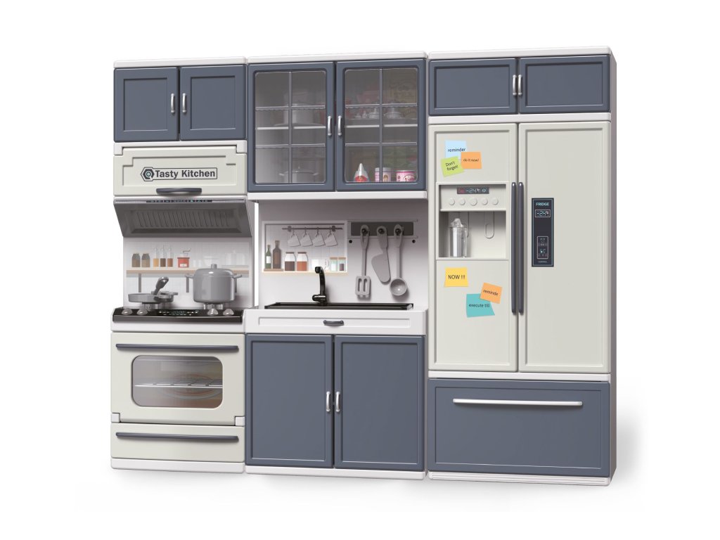 Kuchyňka s efekty. Rozměry 36x7x30 cm. Světelné a zvukové efekty tlačítkem na sporáku. 3xAG13 baterie do sporáku součástí. Obsah - trouba se sporákem, odpařovač, dřez, lednice, skříňky, nádobí, jídlo.Doplňkové parametry
