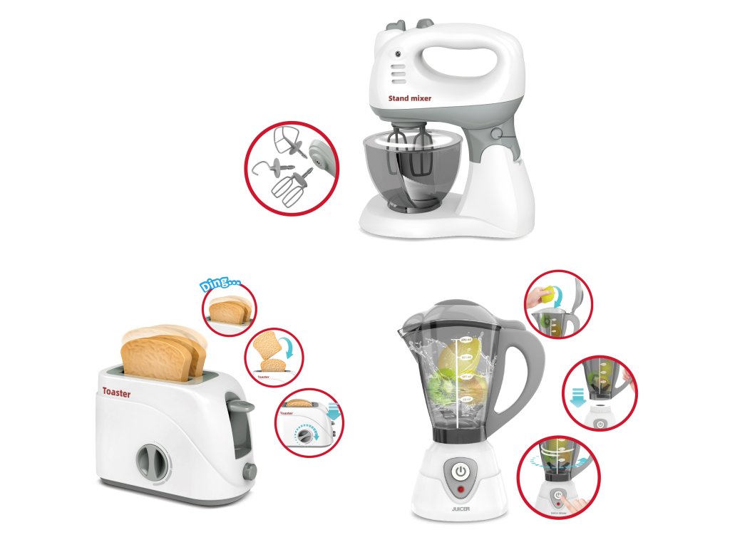 Kuchyňské spotřebiče set s efekty. Mixér s ovocem: on/off přepínač baterie 2xAA nejsou součástí, rozměry: 11x14x23cm, světelné efekty. návod na použití na obale. Nádoba je odnímatelná. Toustovač: rozměry 17x9.2x16cm. Páčkou vpravo se tousty zasunou dovnitř. Nastavením kolečka vepředu začne běžet časovač. Po vypršení času tousty vyskočí. Šlehač: rozměry 20,5x9,6x18cm on/off vypínač, 3náhradní metly, světelné efekty, mísa je odnímatelná. 2xAA baterie není součástí.Doplňkové parametry
