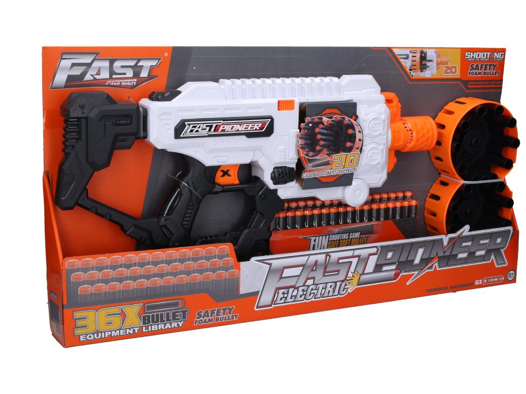 Kulomet s 36 pěnovými náboji. Rozměry 52x20x23 cm. 6xAA baterie nejsou součástí. 2 zásobníky, každý na 10 nábojů součástí. Oranžové tlačítko na uvolnění zásobníku. Obrázkový návod na použití na zadní straně obalu.Doplňkové parametry