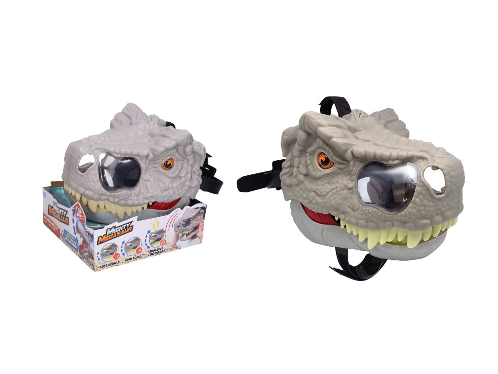 Maska se nasazuje na hlavu. Pohybem hlavy se otevírá čelist, svítí oči a aktivuje se dinosauří řev. Zvukové efekty. 3 polohy otevření čelistí s různými zvuky (vrčení, slabší řev, hlasitý řev). Tlačítko on/off. 2xAAA baterie součástí.