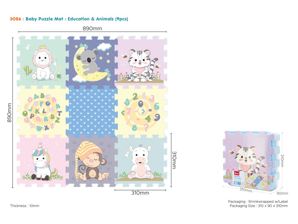 Měkké bloky se zvířátky naučné. Rozměry 1 části 31x31 cm. Balení obsahuje 9 ks. Rozměry při sestavení do čtverce, 89x89 cm.Doplňkové parametry