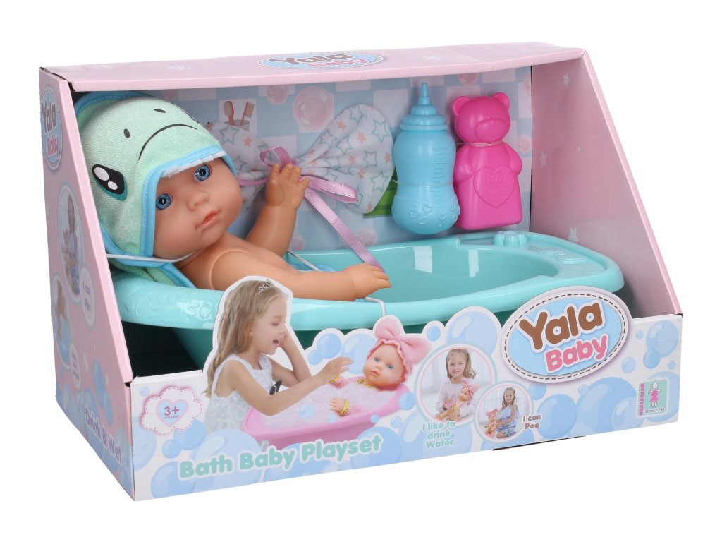Obsahuje miminko, vaničku, potřeby na koupání a župánek.