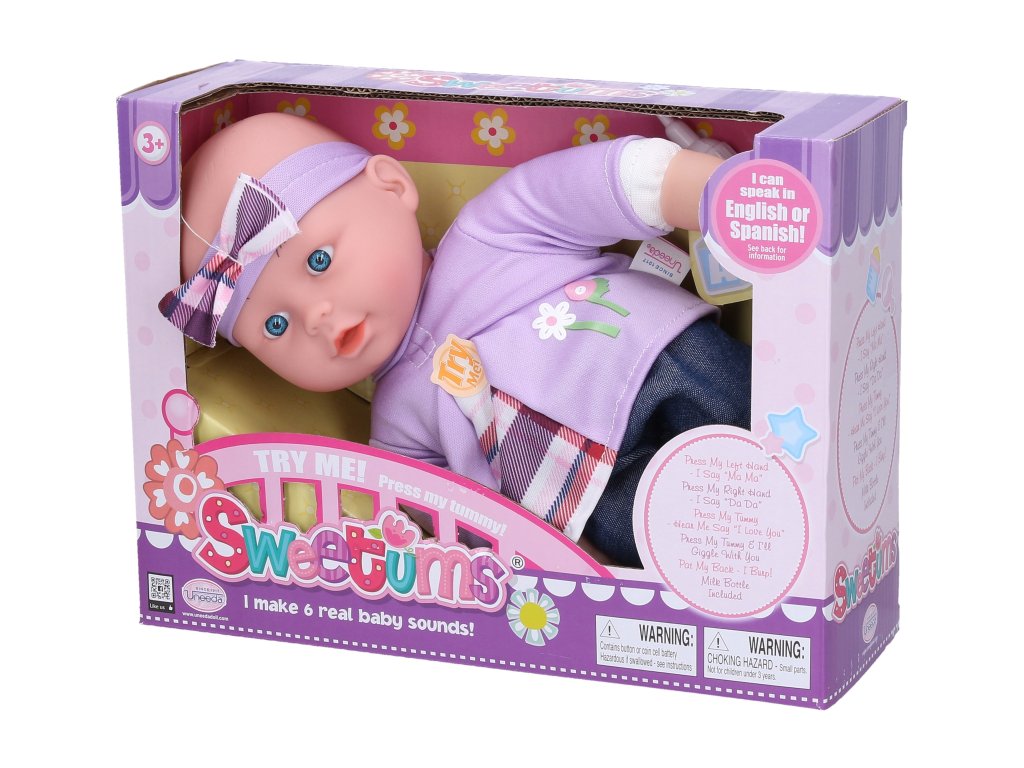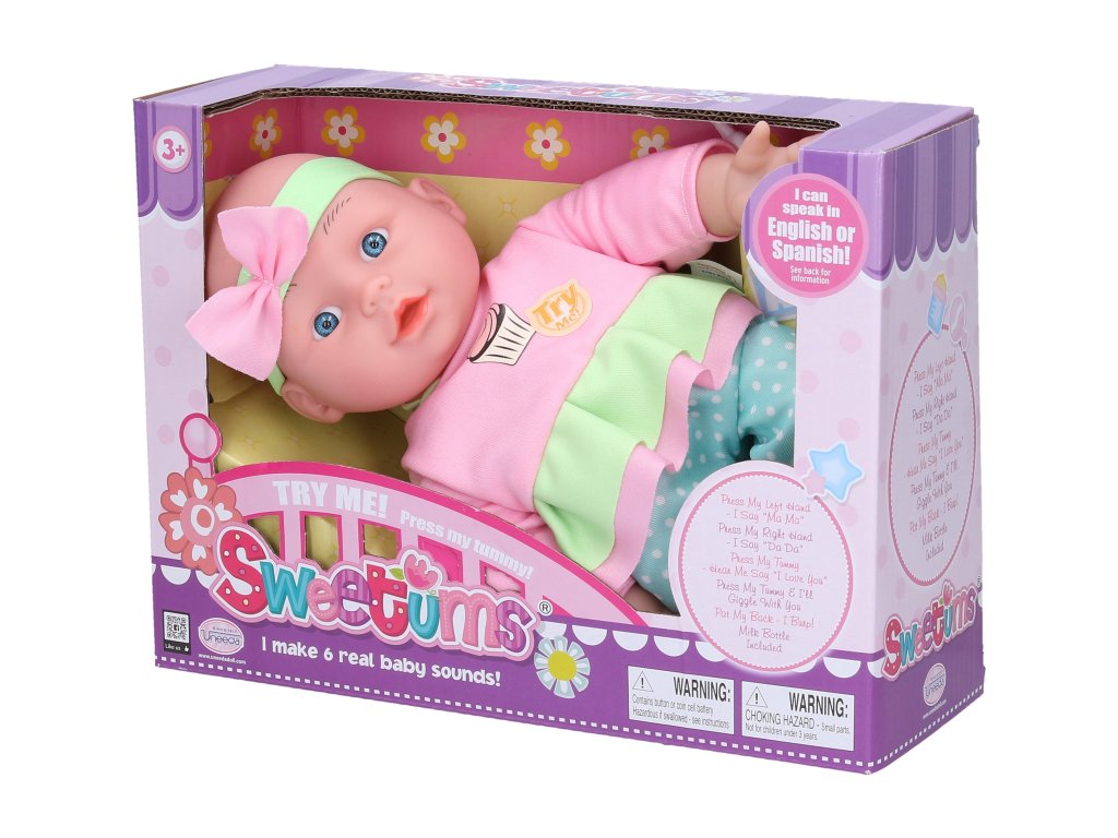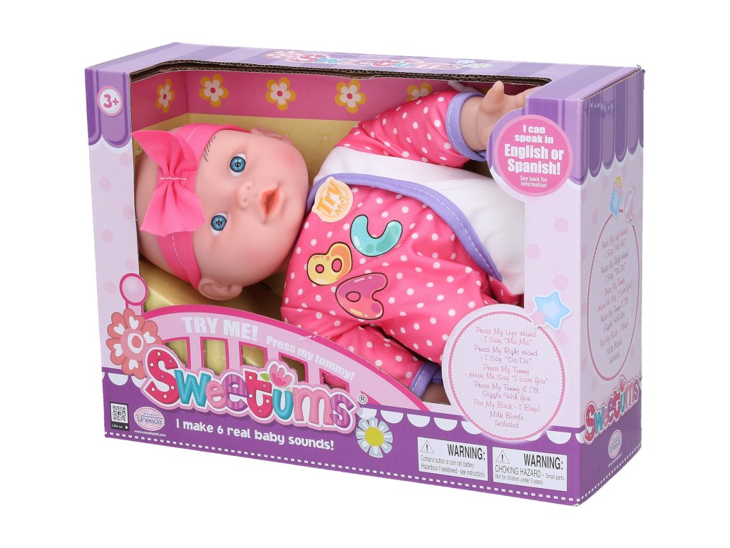 Miminko měkké mluvící. Velikost 28 cm. Součástí láhev. Stlačením levé dlaně říká "máma", stlačením pravé dlaně říká "táta", stlačením hrudníku říká "I love you" a směje se. 3xAG13 baterie součástí. 3 varianty.Doplňkové parametry