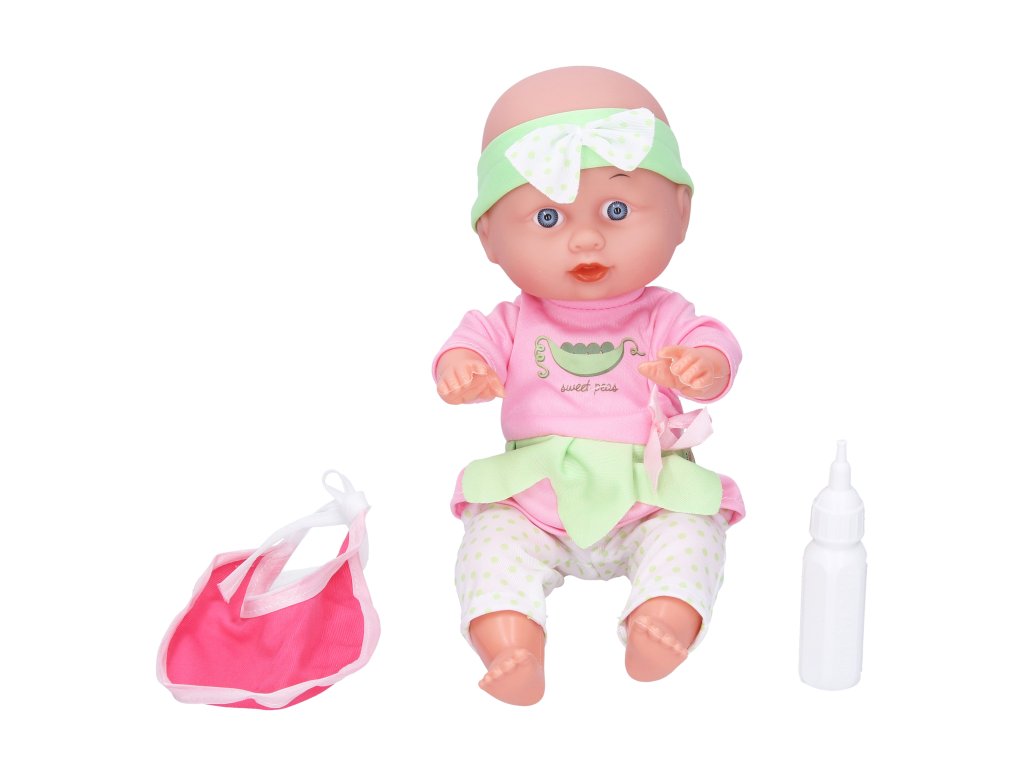 Miminko s kočárkem. Velikost 28 cm. Balení obsahuje miminko, složený kočárek, bryndáček a lahvičku.Doplňkové parametry