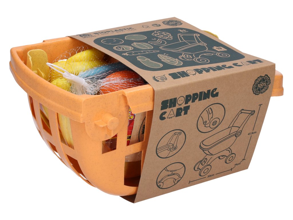Nákupní vozík s potravinami je vyroben z ekologického bioplastu a zahrnuje různé potraviny