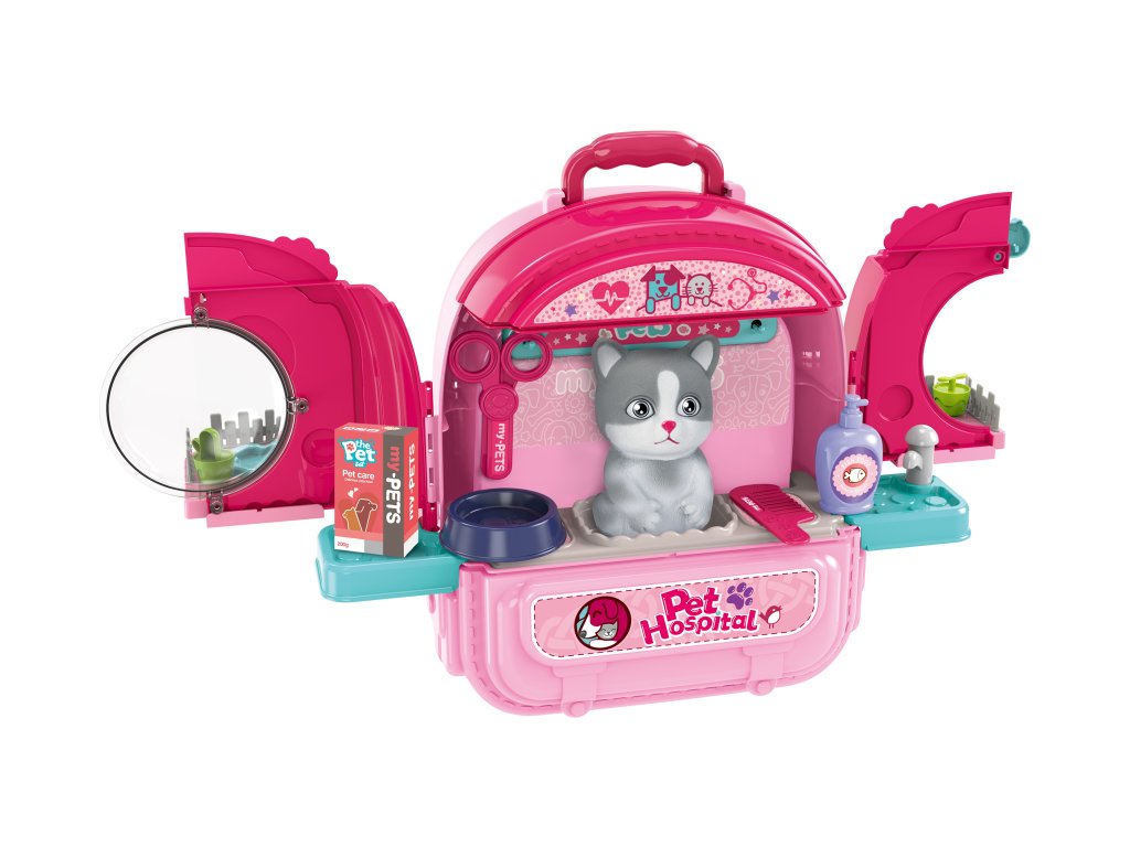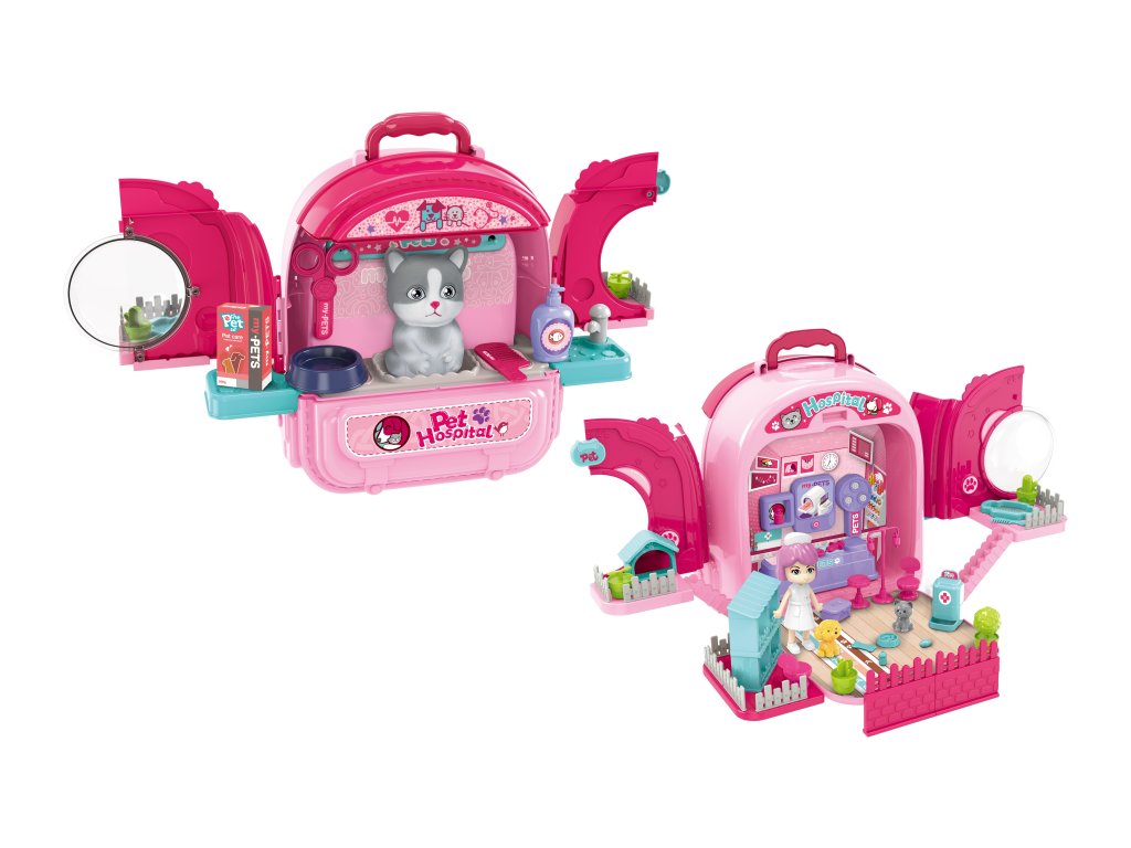 Balení obsahuje zařízení zvířecí ordinace, figurku kočky a příslušenství: misku, lahvičky, panenku zdravotní sestru, drobnosti do ordinace.