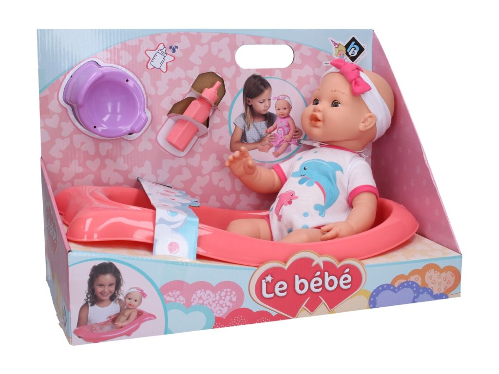 Panenka čurající set s vaničkou. Velikost vaničky 41cm. Obsahuje panenku, lahvičku, nočník, vaničku. Panenka má pohyblivou hlavu a končetiny. Při položení na záda zavře oči.Doplňkové parametry