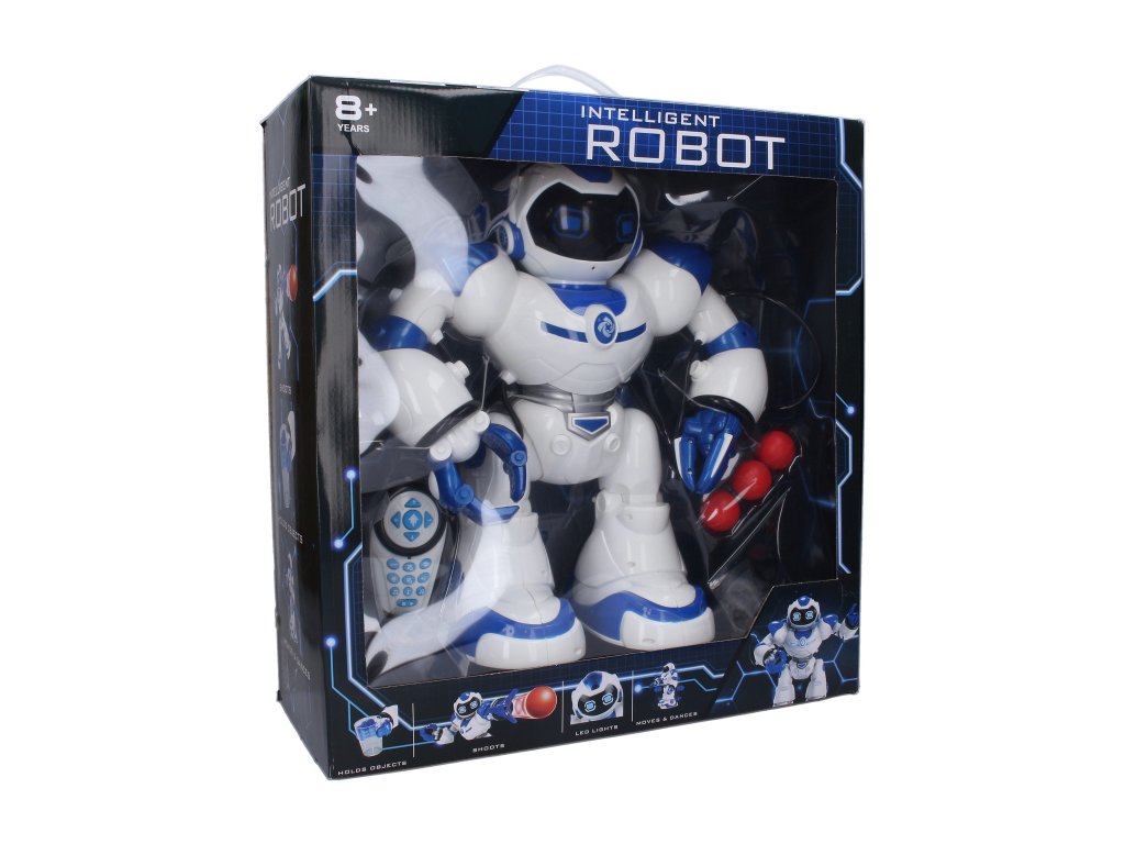 Funkce - střílí míčky z levé ruky, drží předměty v pravé ruce, podsvětlený obličej, programování, chůze, tanec, hudba, demo režim, nastavení hlasitosti.