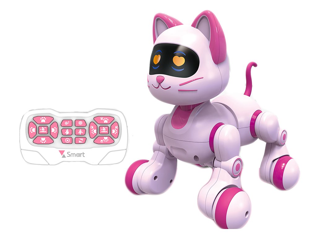 Robotická kočka RC na dálkové ovládání. Rozměry 21x18x13 cm. Infračervený port. Bateriový pack 3.7V 400mAh Li-ion do kočky, 2xAAA do ovladače nejsou součástí. USB kabel součástí. Přepínač ON/OFF v zadní části hlavy. Reaguje na dotyk hlavy. Ovladač - pohyb, demo, programování (až 30 kroků), nastavení hlasitosti.Doplňkové parametry