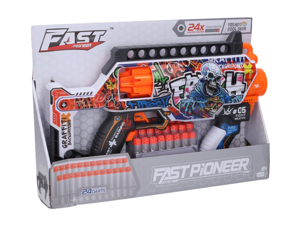 Obsah balení - samopal, 24 pěnových nábojů. Baterie 4xAA, nejsou součástí balení (přihrádka na levém boku zbraně).
