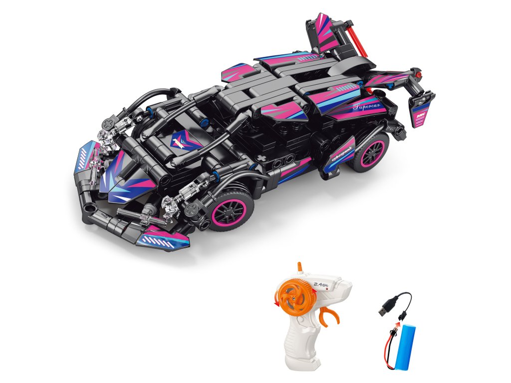 Stavebnice Auto růžové RC na dálkové ovládání. 323 dílků. Rozměry 18,7x8,8x6 cm. Pistolový ovladač. Frekvence 2.4GHz. Bateriový pack 3.7V 350mAh Li-ion do auta součástí, 2xAA do ovladače nejsou součástí. USB kabel součástí. Přepínač ON/OFF na spodní straně auta a na boční straně ovladače. Obrázkový návod bez textu a nálepky součástí.Doplňkové parametry