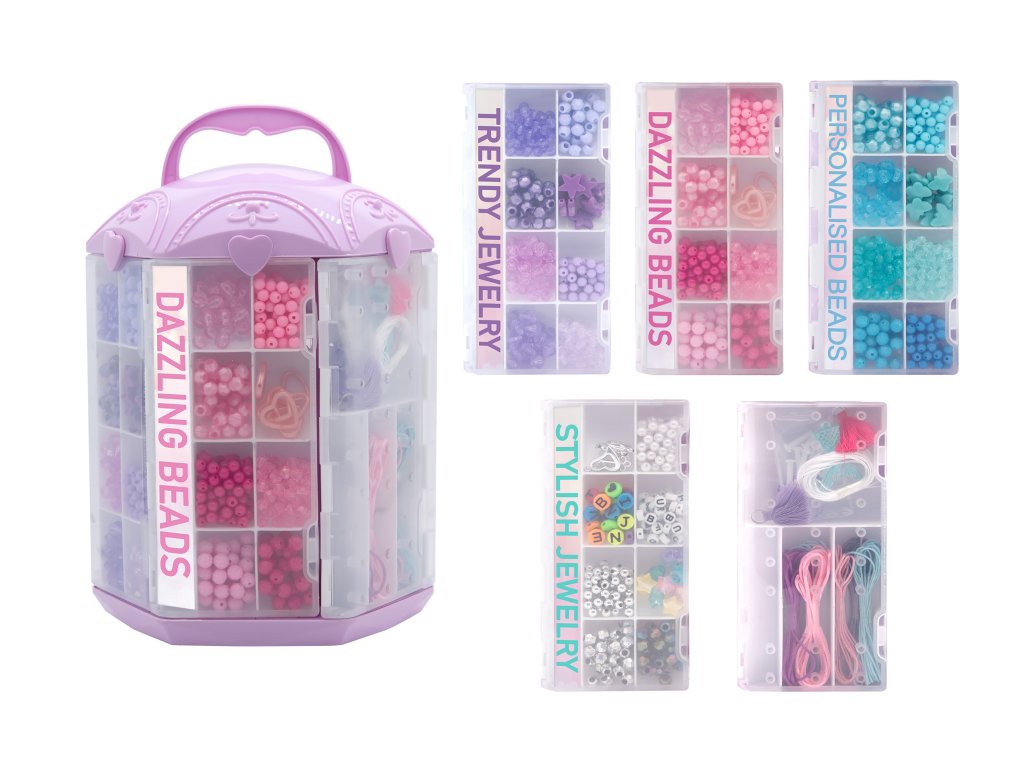Tvorba náramků skříňka. Velikost 27cm. Obsahuje 5 krabiček s korálky a provázky na tvorbu náramků. Krabičky se dají umístit svisle na skříňku pro lepší organizaci korálků. Skříňka má místo na hotové náramky. madlo na přenášení.Doplňkové parametry
