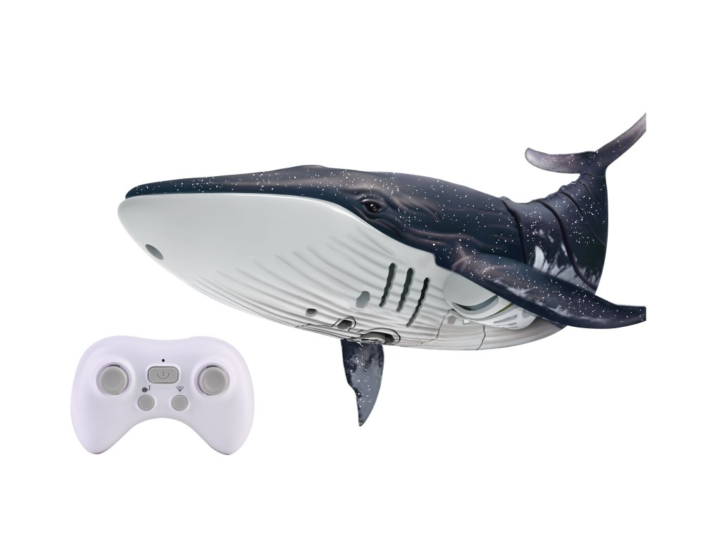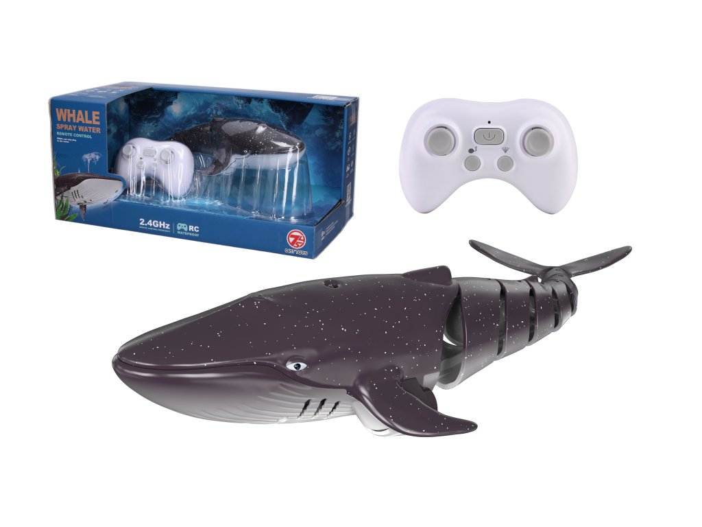 Velryba stříkající vodu RC na dálkové ovládání. Rozměry 35x12x8 cm. Frekvence 2.4GHz. Světelné efekty. 3.7V bateriový pack do velryby součástí, 2xAA do ovladače nejsou součástí. USB adaptér součástí. Ovladač - tlačítko ON/OFF, levé kulaté tlačítko - demo režim, pravé kulaté tlačítko - vodotrysk. Senzory na vodu na spodní straně velryby.Doplňkové parametry