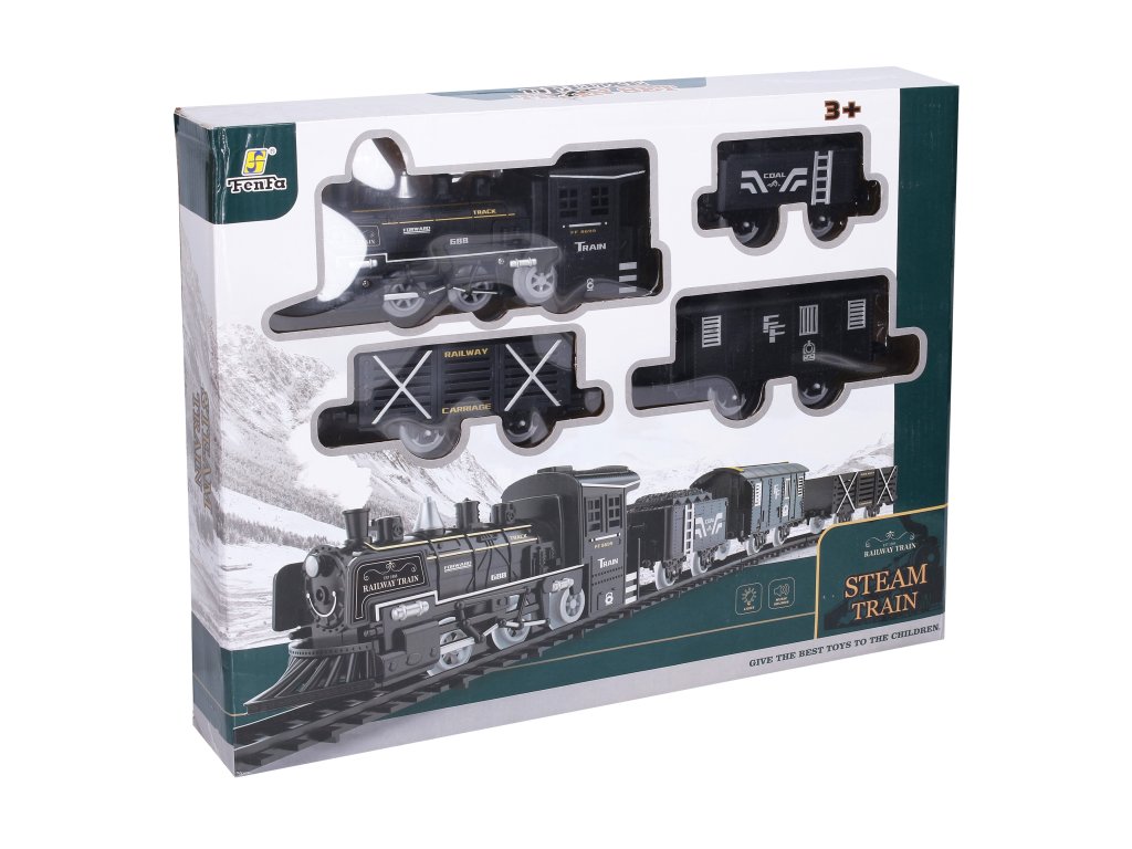 Obsahuje, mašinku, 3 vagóny, 4 rovné kolejnice, 6 zahnutých kolejnic, nádobku na vodu. Nádržka na vodu pod stříbrným komínkem.