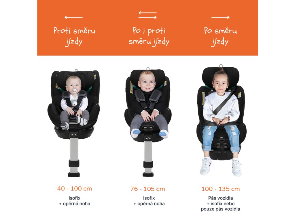se autosedačka poutá pomocí isofixu a opěrné nohy. Děti mohou jezdit proti směru