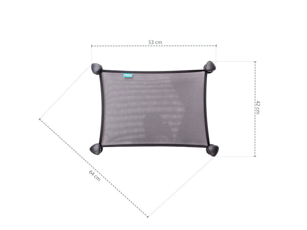 Díky přísavkám na okno je možné flexibilní pružnou síť libovolně používat na všechna okna ve voze a přemísťovat ji přesně tam, kde je potřeba. Ochranná síťovina proti UV záření je odolná vůči odéru. Díky své pružnosti dokáže téměř zdvojnásobit svoji velikost.