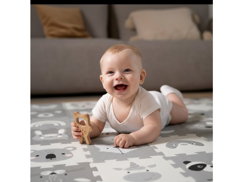 Pěnové puzzle je vyrobené z kvalitní EVA pěny. Plní funkci nejen podložky, která zajistí pohodlí díky izolaci od chladu, ale zároveň praktické pomůcky pro první měsíce miminka, kdy poskytuje měkkou oporu při pasení koníčku nebo prvním lezení.